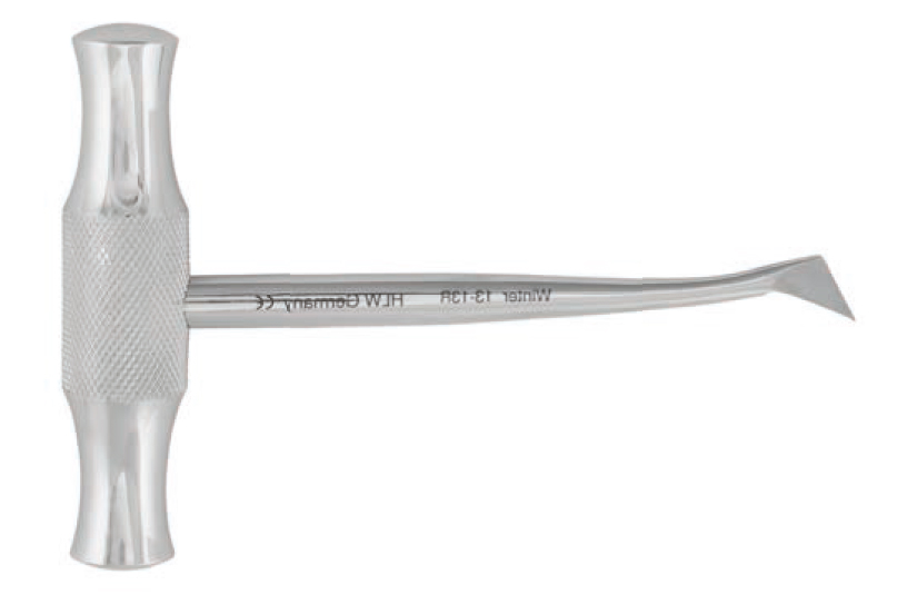 У изогнутого инструмента ручка расположена перпендикулярно по отношению к соединительному стержню, а на середину ручки элеватора нанесены ретенционные узоры. Благодаря такой конструкции инструмент надежно фиксируется и не скользит в руке.