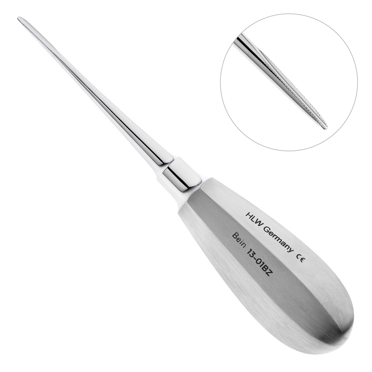 Элеватор конструкции Бейна производства немецкой компании HLW Dental Instruments применяется для удаления корней и зубов на верхней и нижней челюсти.