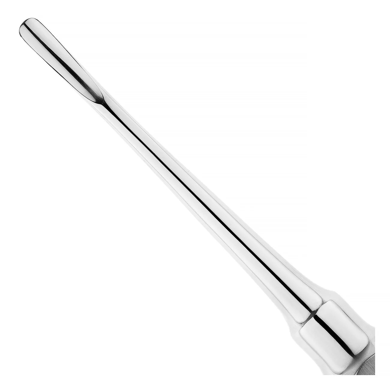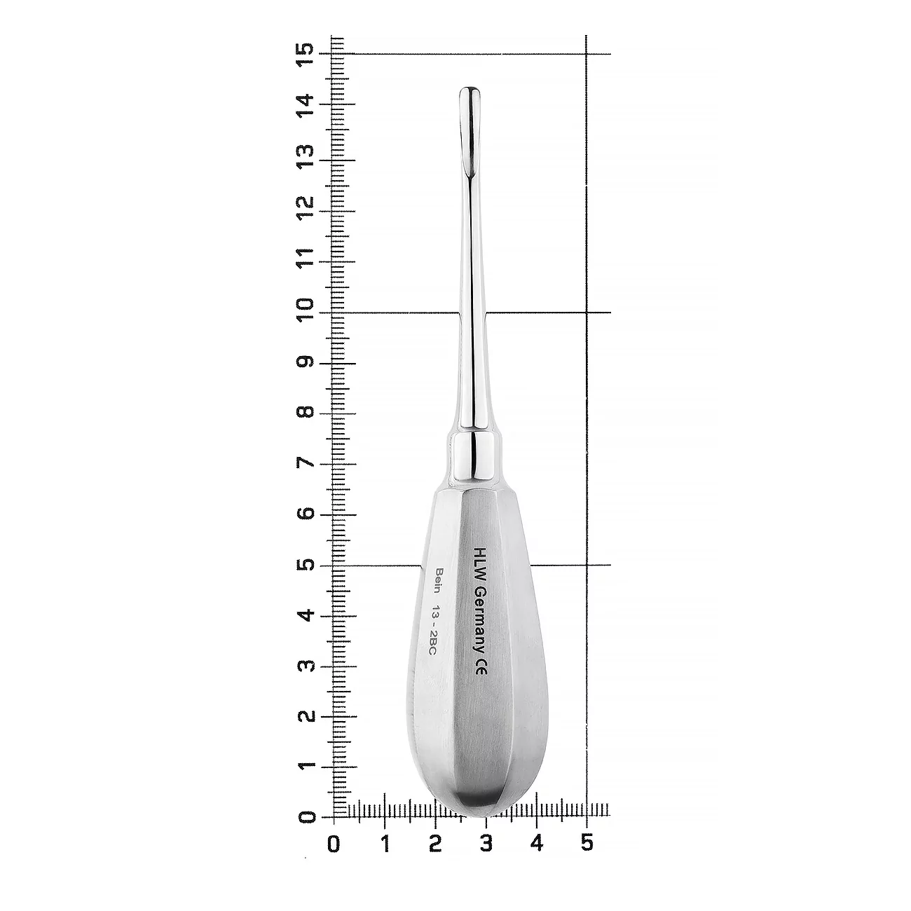 Щечка изогнутого инструмента имеет овальную форму, заостренный край и выемку в форме жёлоба, что обеспечивает легкое введение элеватора в лунку зуба и позволяет без особых усилий удалить корень или зуб в ротовой полости. Ширина рабочей части инструмента 4 мм.