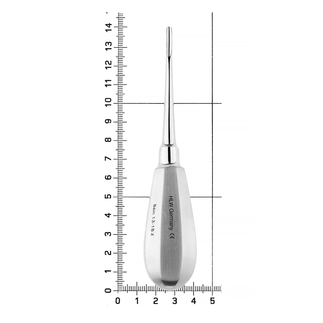 Ширина щечки инструмента 3 мм. Рабочая часть прямого элеватора имеет закруглённый край, продольные насечки и выемку в форме жёлоба, что позволяет ввести инструмент между корнем зуба и стенкой альвеолы, и без затруднений провести операцию по удалению корней и зубов в ротовой полости.