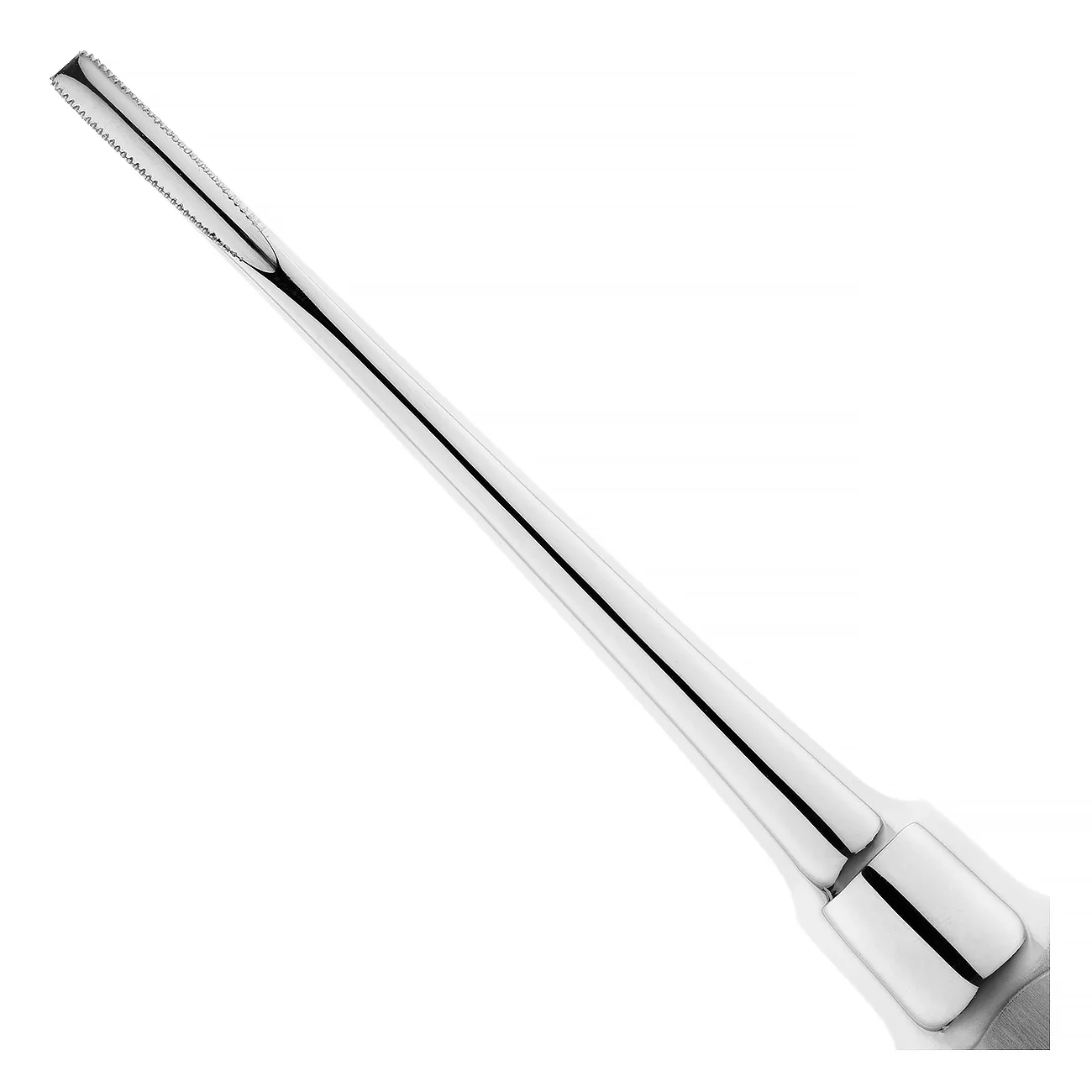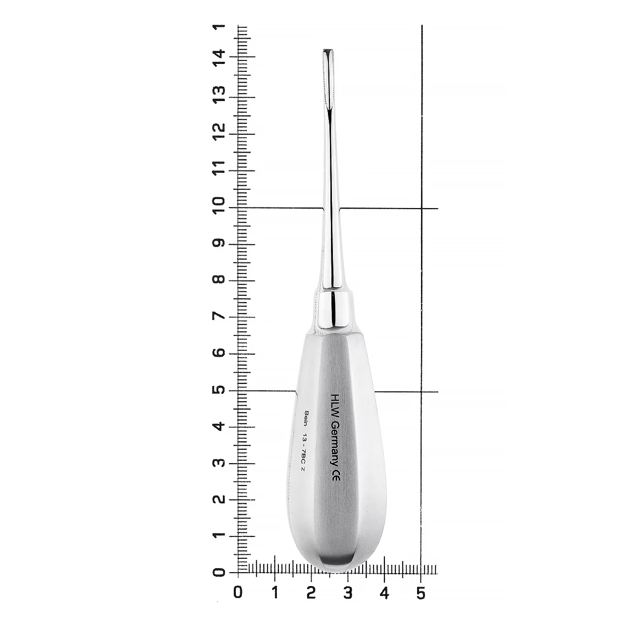 Ширина рабочей части инструмента 3 мм. Щечка изогнутого элеватора имеет прямоугольный край с насечками на внешней поверхности по всей длине и выемку в форме жёлоба, что обеспечивает легкое введение инструмента в лунку зуба и позволяет без особых усилий удалить корень или зуб в ротовой полости.