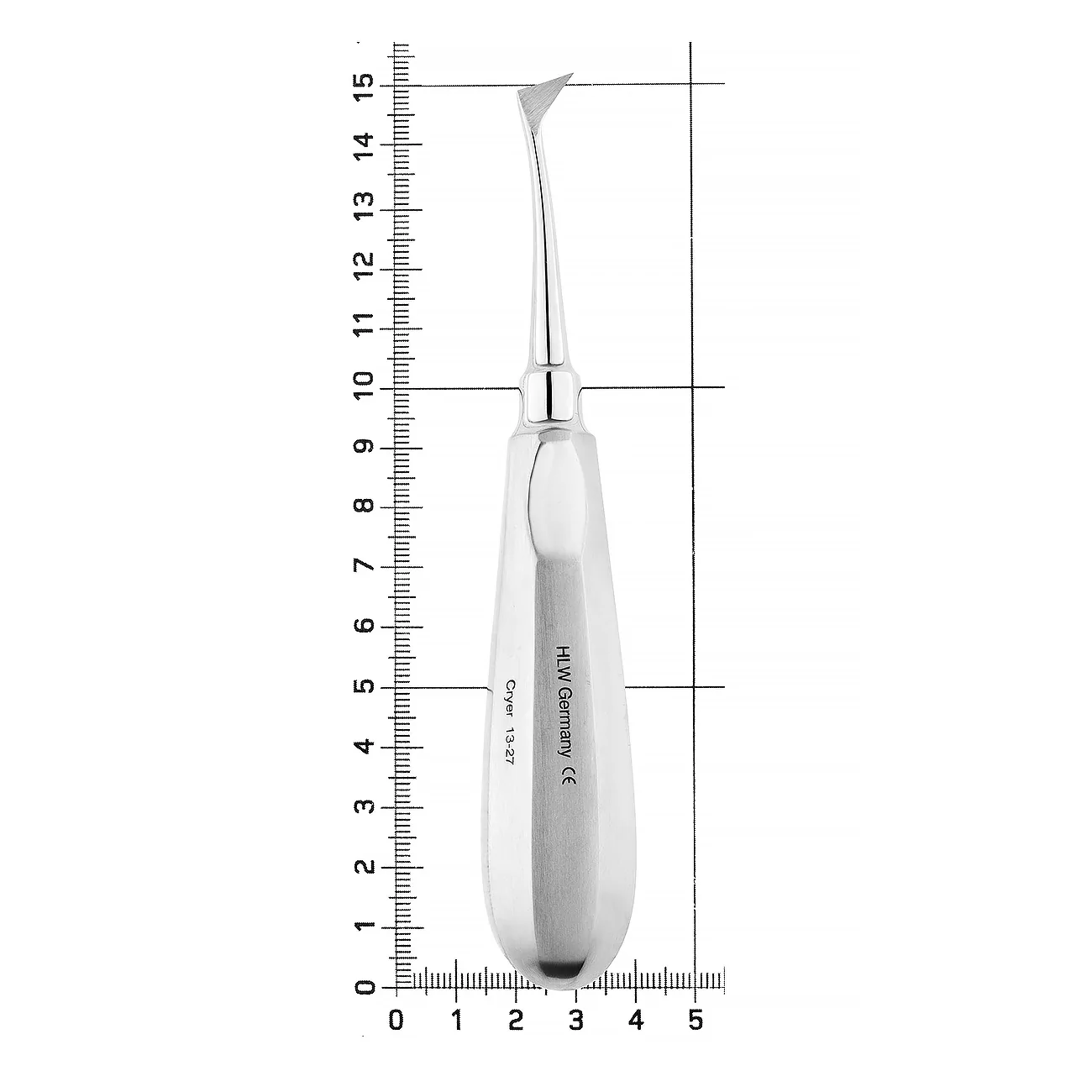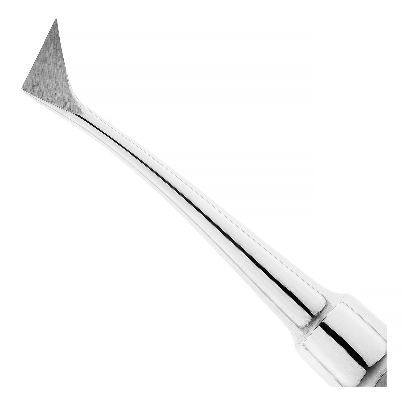 Щечка изогнутого инструмента имеет треугольную форму и заостренный край. Рабочая часть элеватора вводится между корнем зуба и стенкой альвеолы, и путем вращения рукоятки инструмента по или против хода часовой стрелки осуществляется вывихивание зуба.