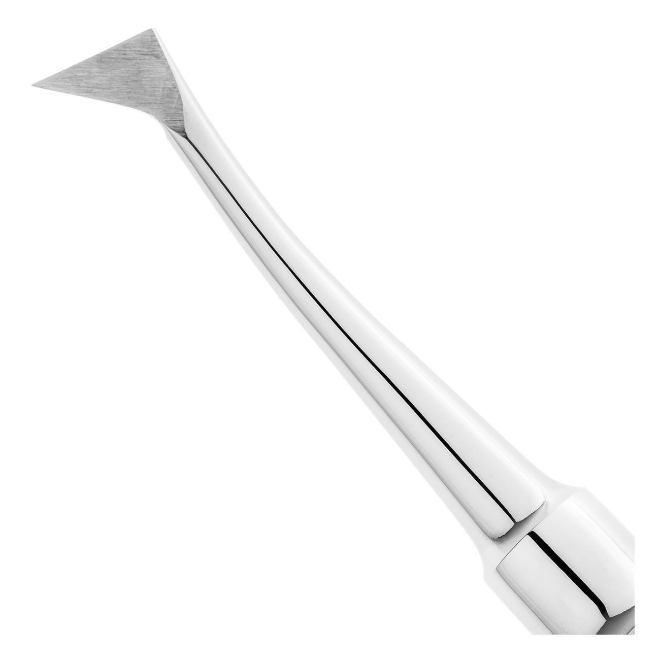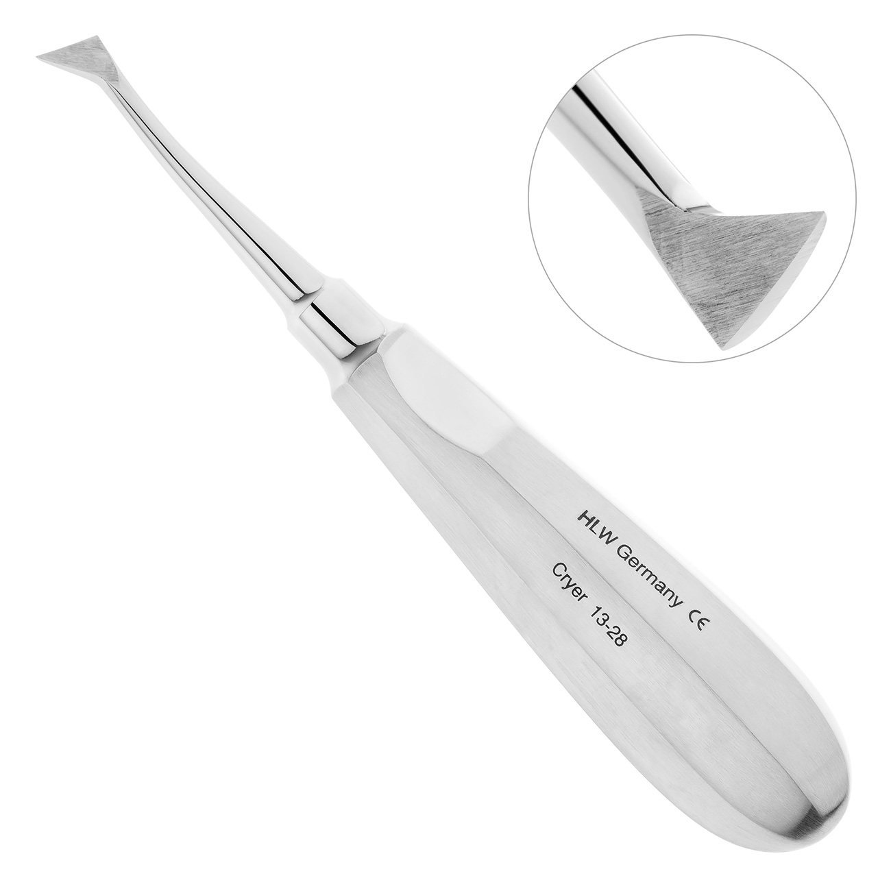Щечка изогнутого инструмента имеет треугольную форму и заостренный край. Рабочая часть элеватора вводится в лунку зуба или корня и путем вращения рукоятки инструмента по или против хода часовой стрелки осуществляется вывихивание зуба.