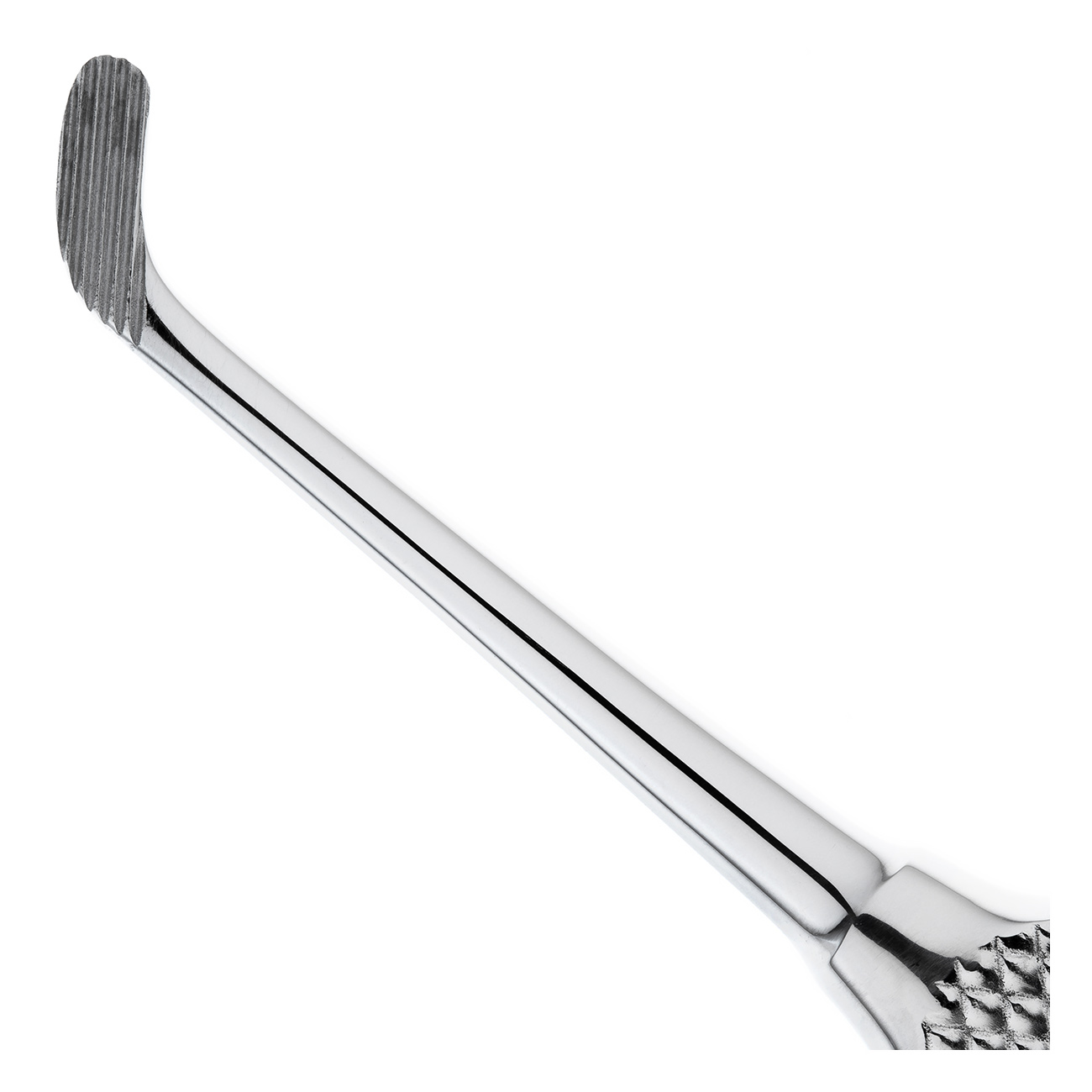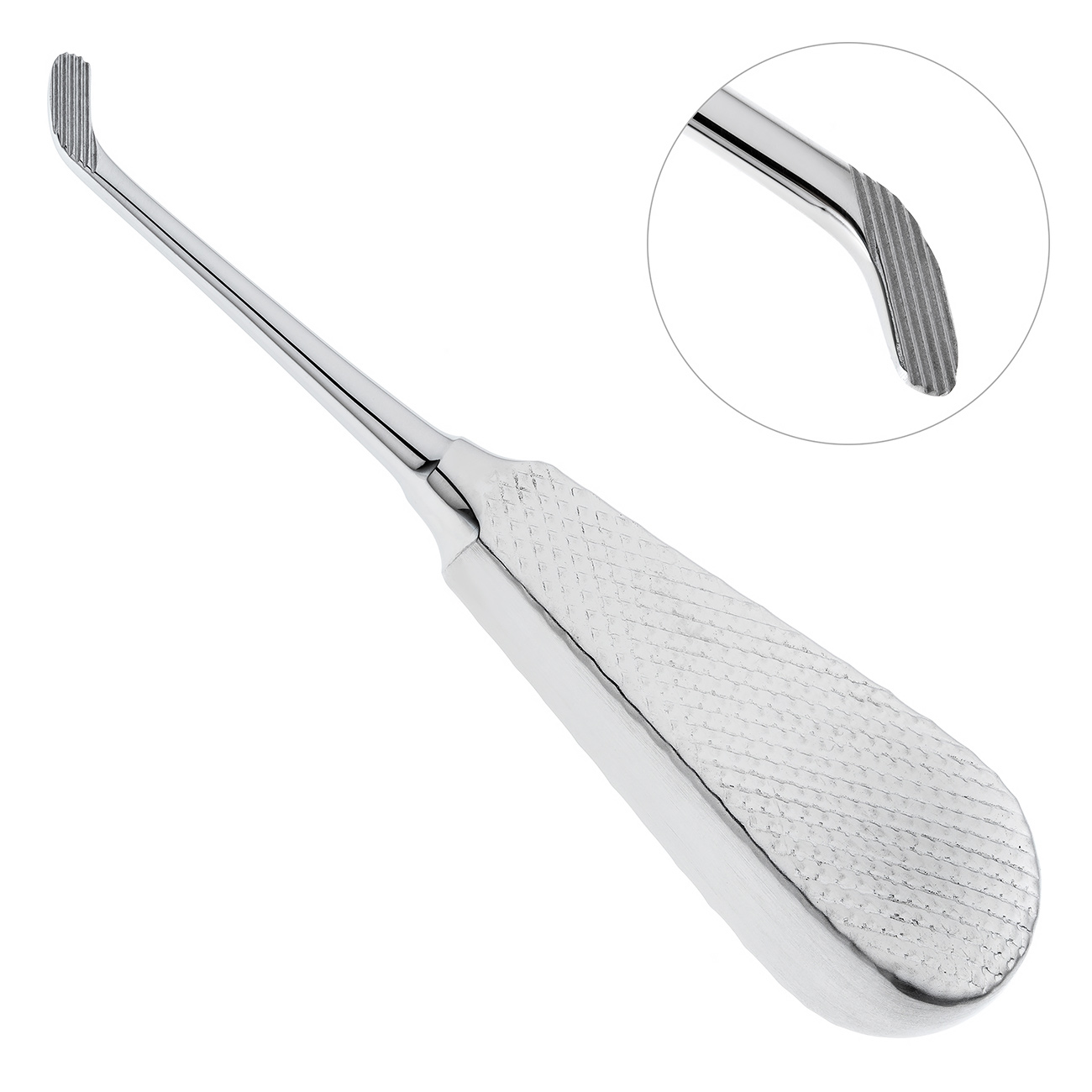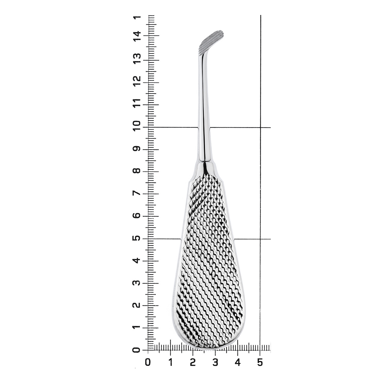 Снаружи ручка элеватора покрыта ретенционным узором, предотвращающим скольжение фаланг пальцев в перчатке. Плоская форма ручки удобна в использовании и способствует проведению операции.