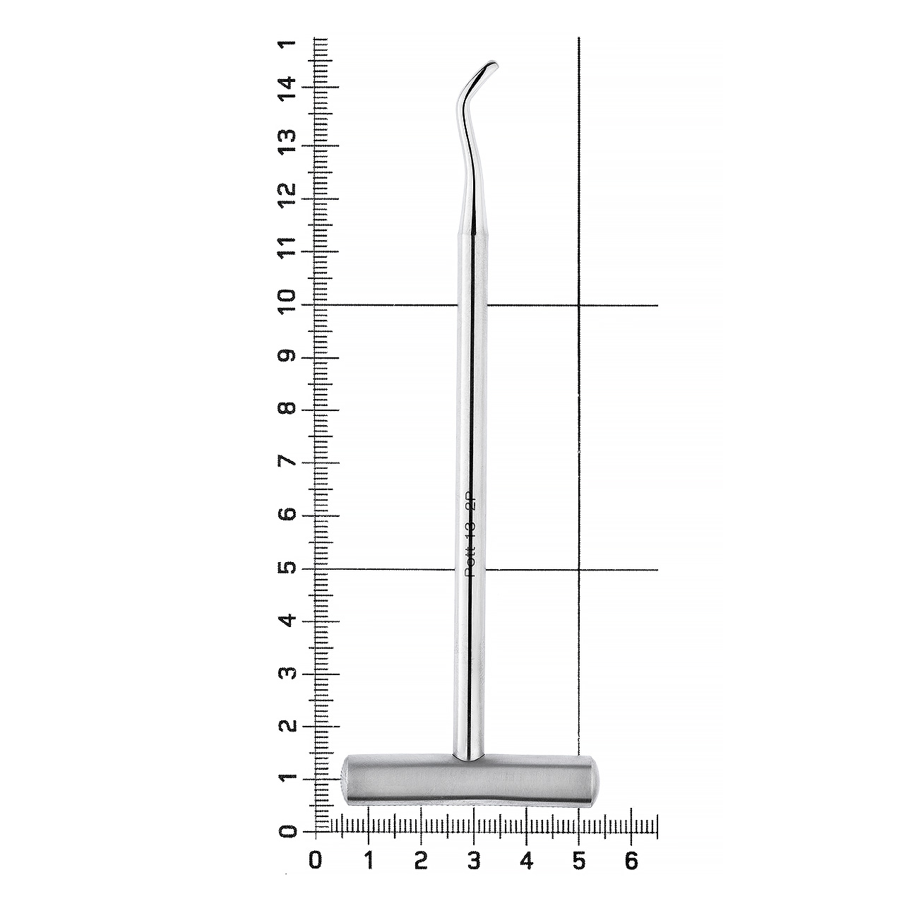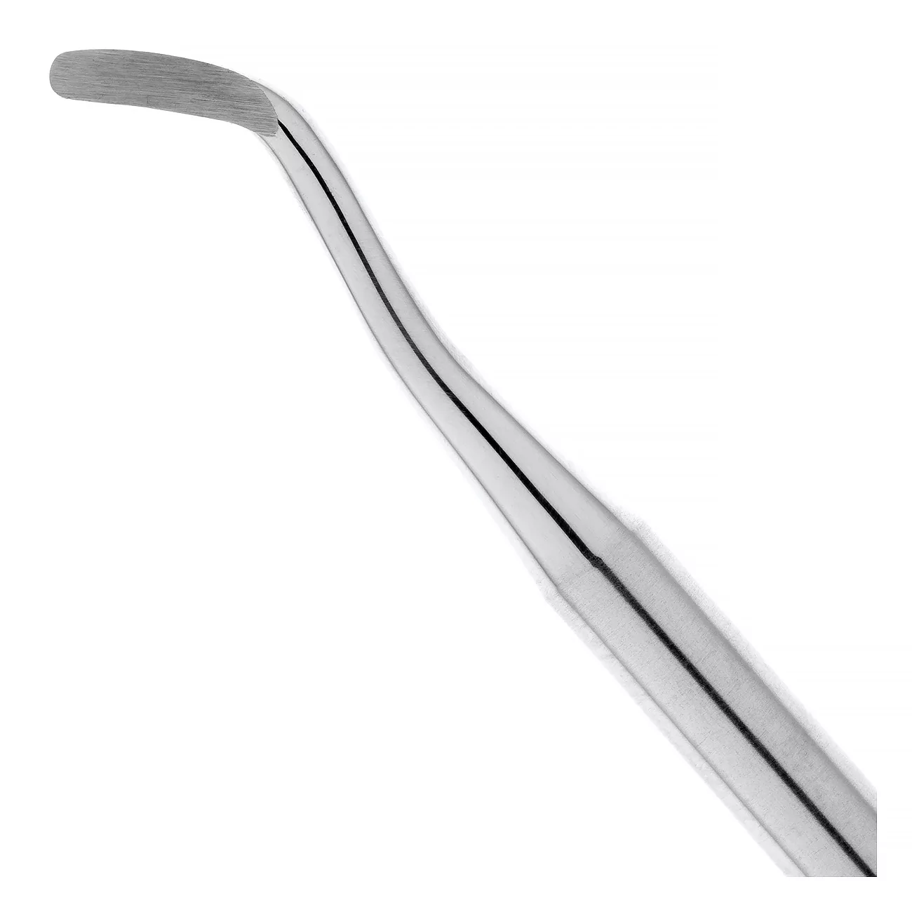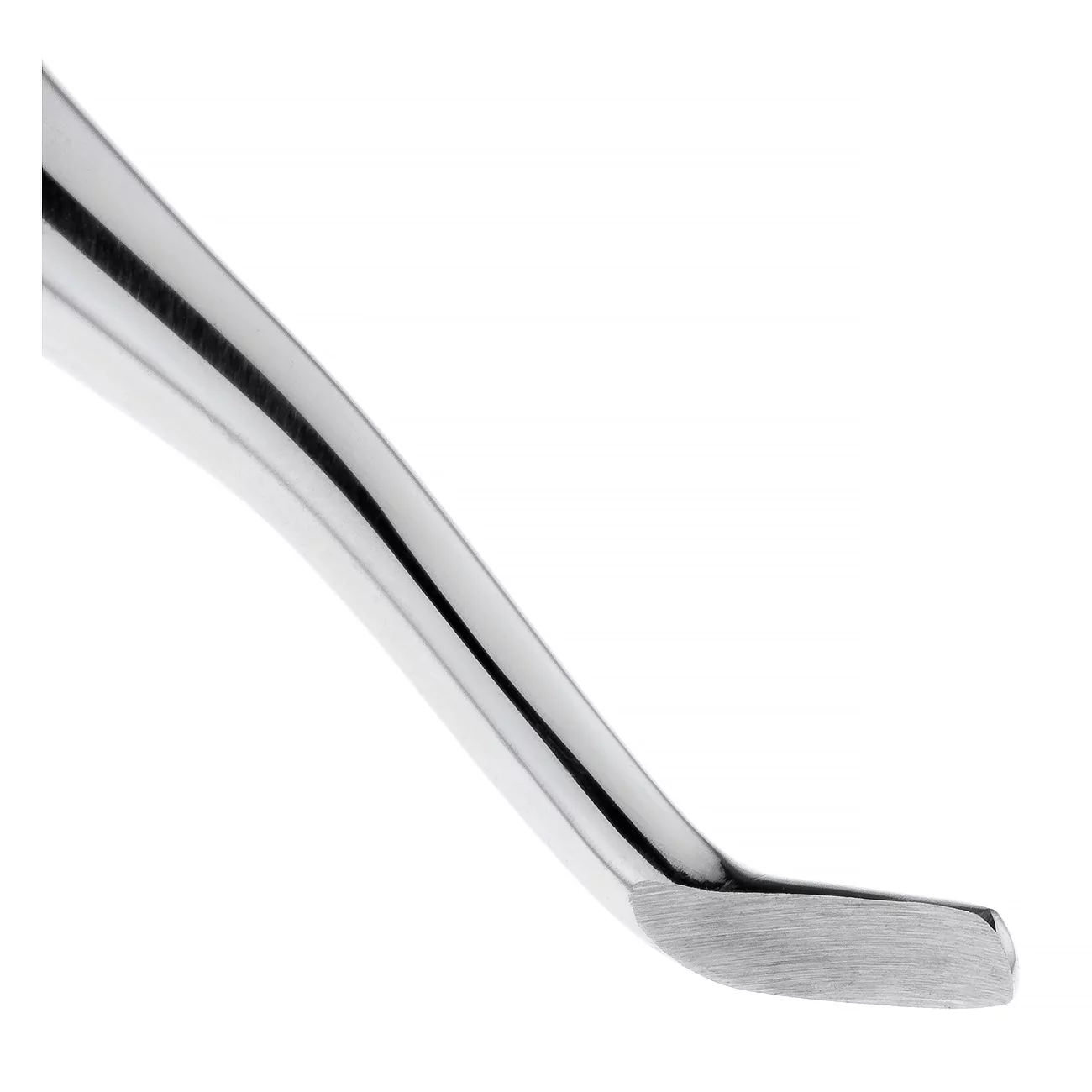 Щечка изогнутого элеватора имеет овальную форму и гладкую рабочую поверхность. Ширина рабочей части инструмента 2,5 мм. Такая конструкция облегчает введение элеватора в лунку зуба и путем вращения рукоятки инструмента по или против хода часовой стрелки осуществляется вывихивание зуба.