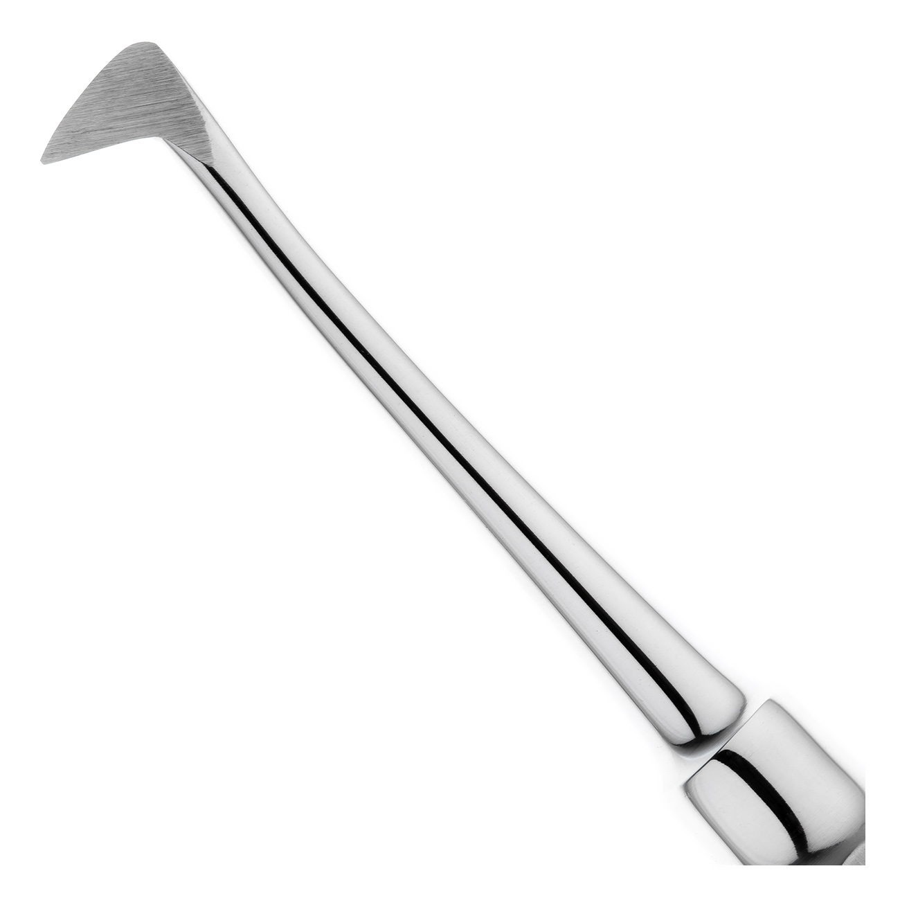 Щечка изогнутого инструмента имеет треугольную форму и заостренный край. Рабочая часть элеватора вводится в лунку зуба и путем вращения рукоятки инструмента по или против хода часовой стрелки осуществляется вывихивание корней зубов на нижней челюсти.