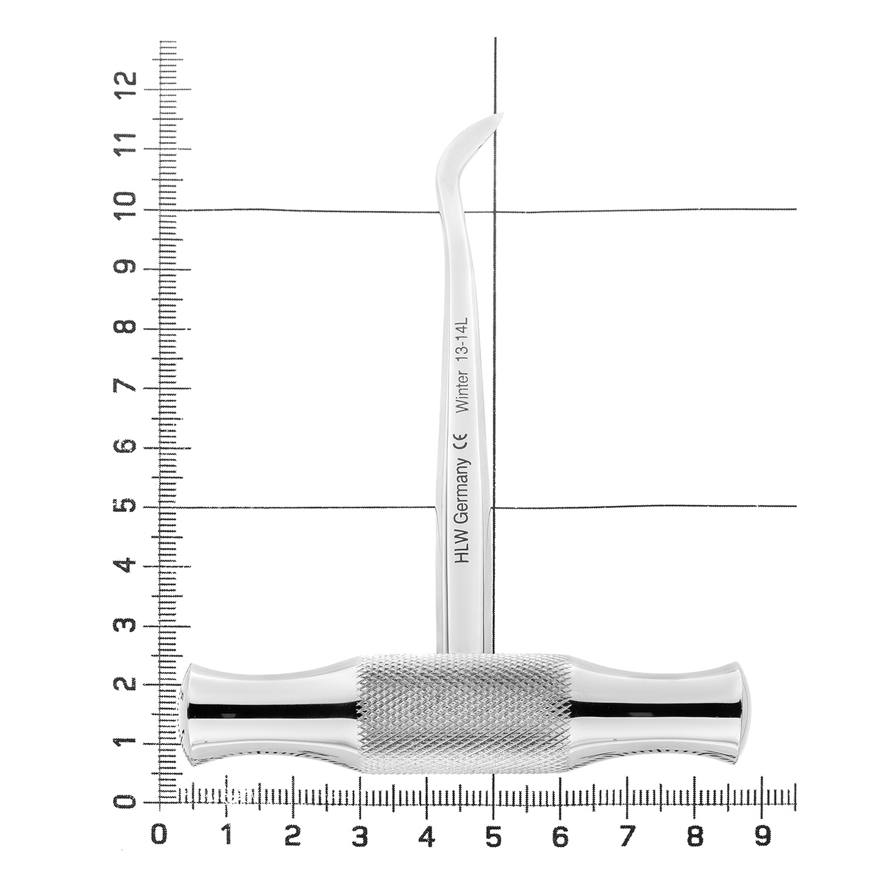 У инструмента ручка расположена перпендикулярно по отношению к соединительному стержню. На середину ручки элеватора нанесены ретенционные узоры. По краям рукоятки расположены цилиндрические выемки для более удобного удержания ручки. Благодаря такой конструкции инструмент надежно фиксируется и не скользит в руке.