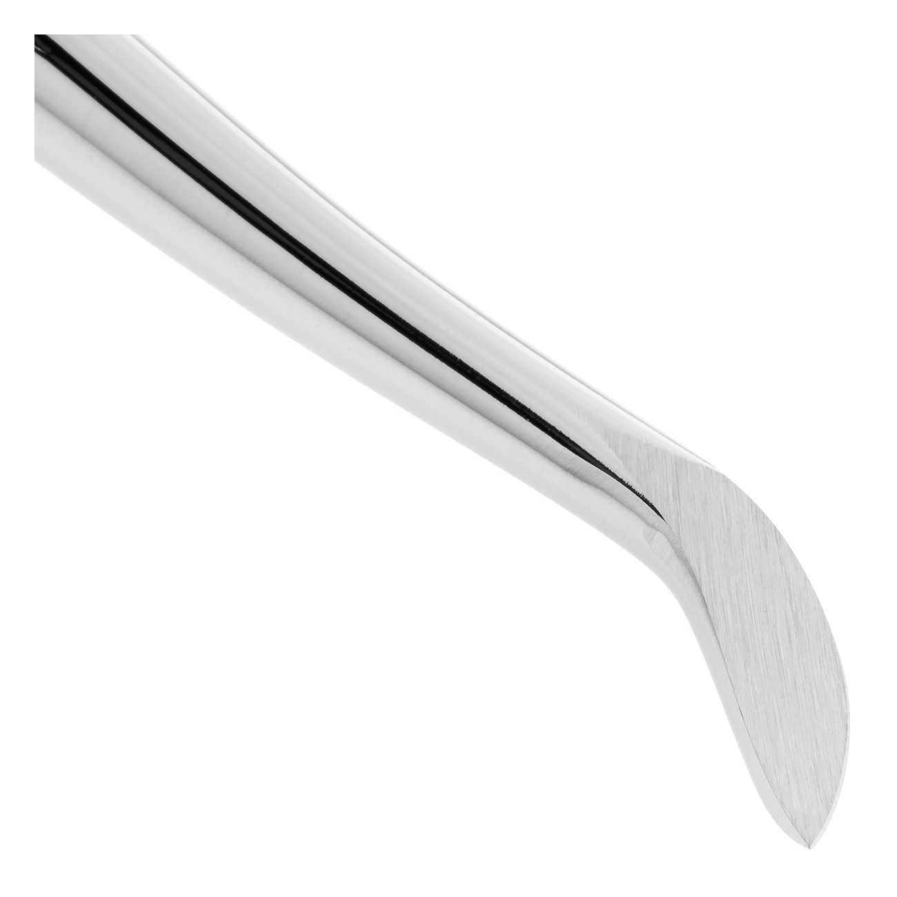 Рабочая часть изогнутого инструмента ассиметричной формы со слегка закругленным острым концом. Такая конструкция облегчает введение элеватора между корнем зуба и стенкой альвеолы и позволяет эффективно провести операцию по вывихиванию зубов на нижней челюсти.