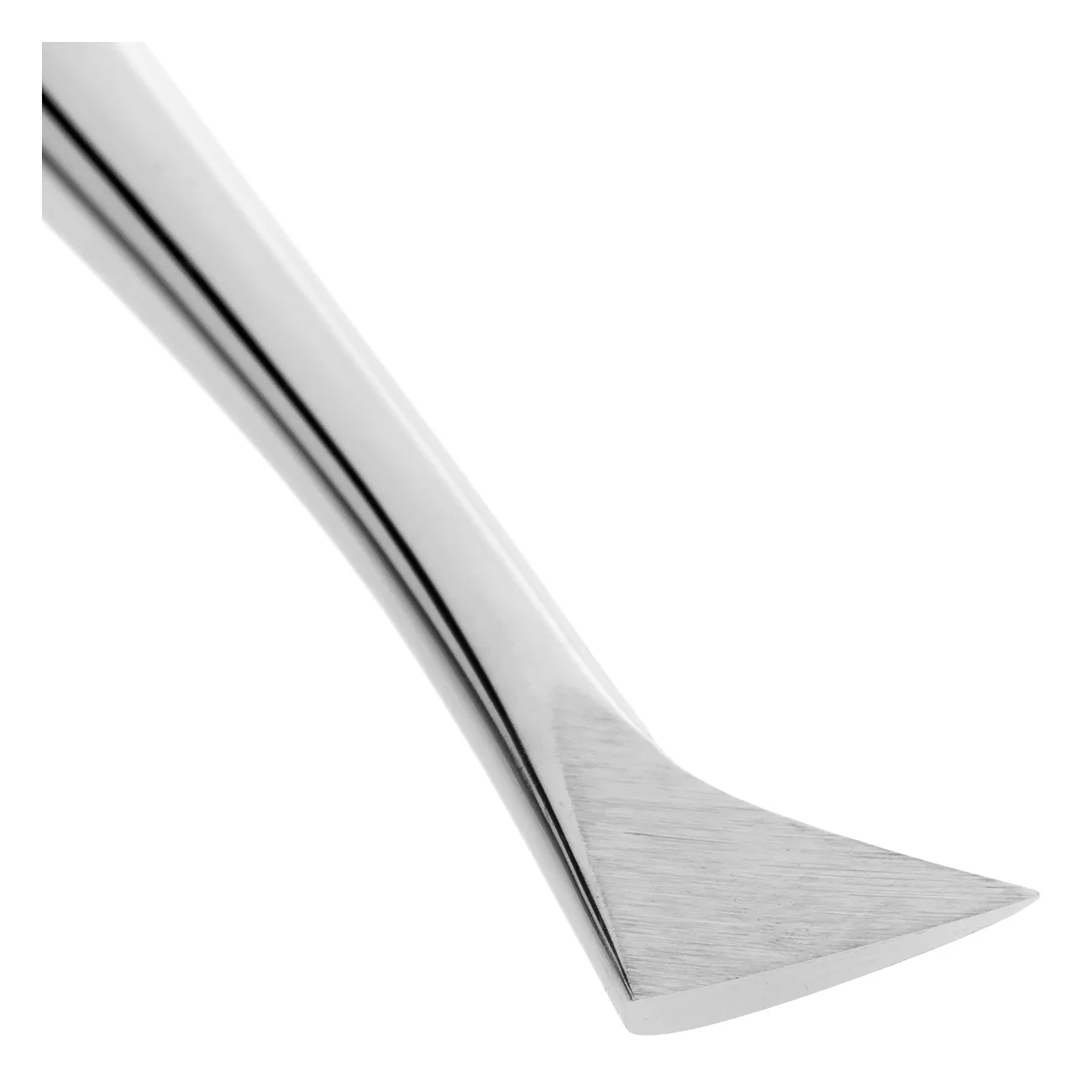 Щечка изогнутого инструмента треугольной формы с острым концом. Благодаря такой конструкции рабочая часть элеватора легко вводится в лунку зуба, и без особых усилий осуществляется вывихивание зуба вращением рукоятки инструмента по или против хода часовой стрелки.