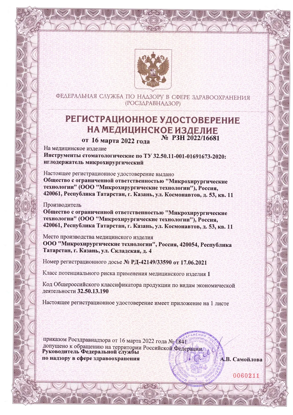 Предназначен для проведения хирургических манипуляций в пародонтальной хирургии и имплантологии: для захвата, удержания микроигл и шовного материала.