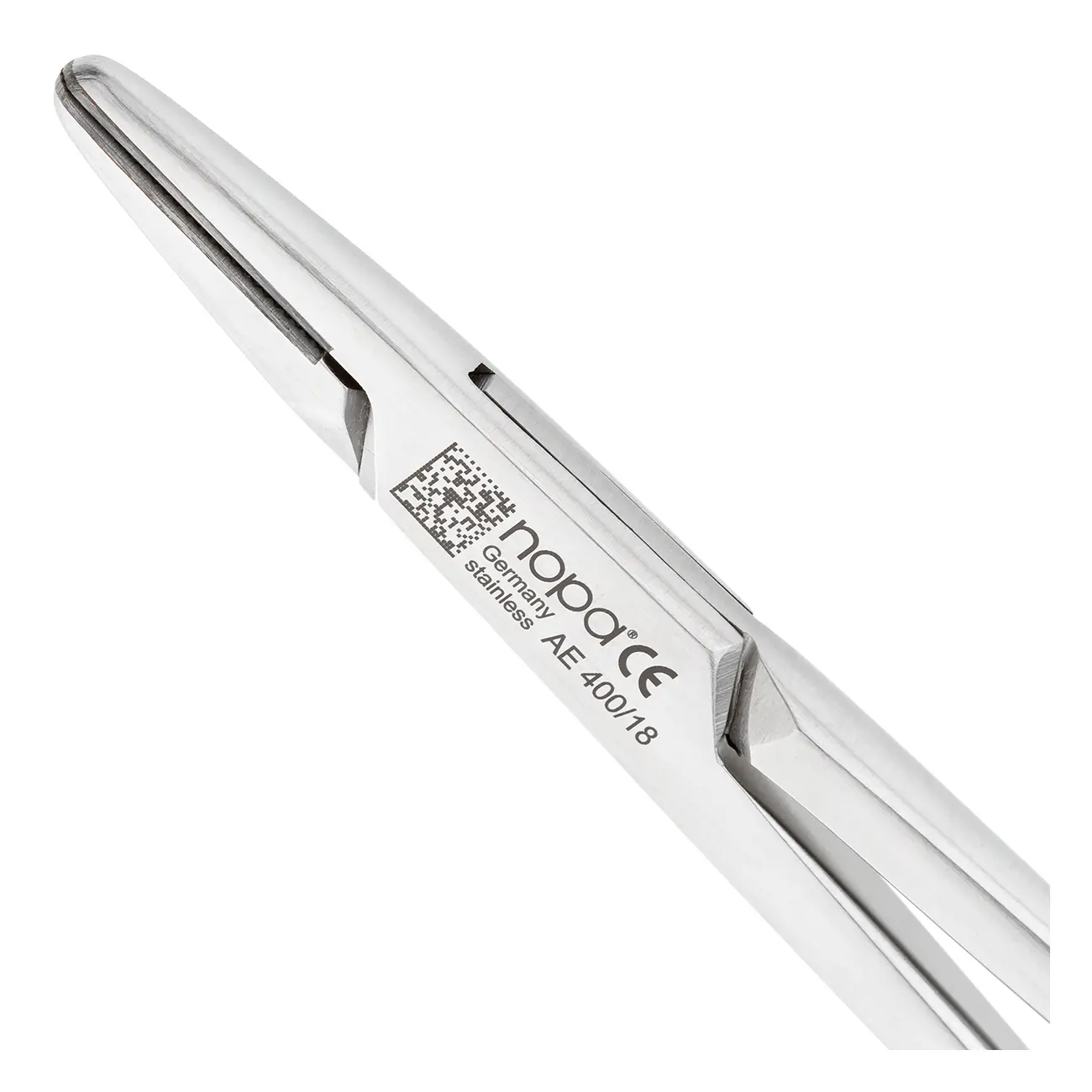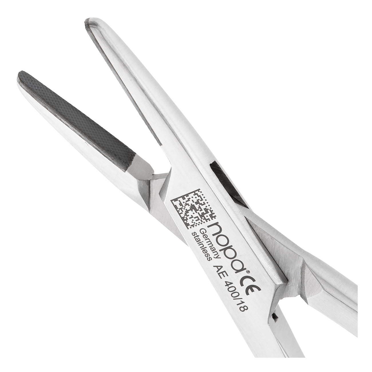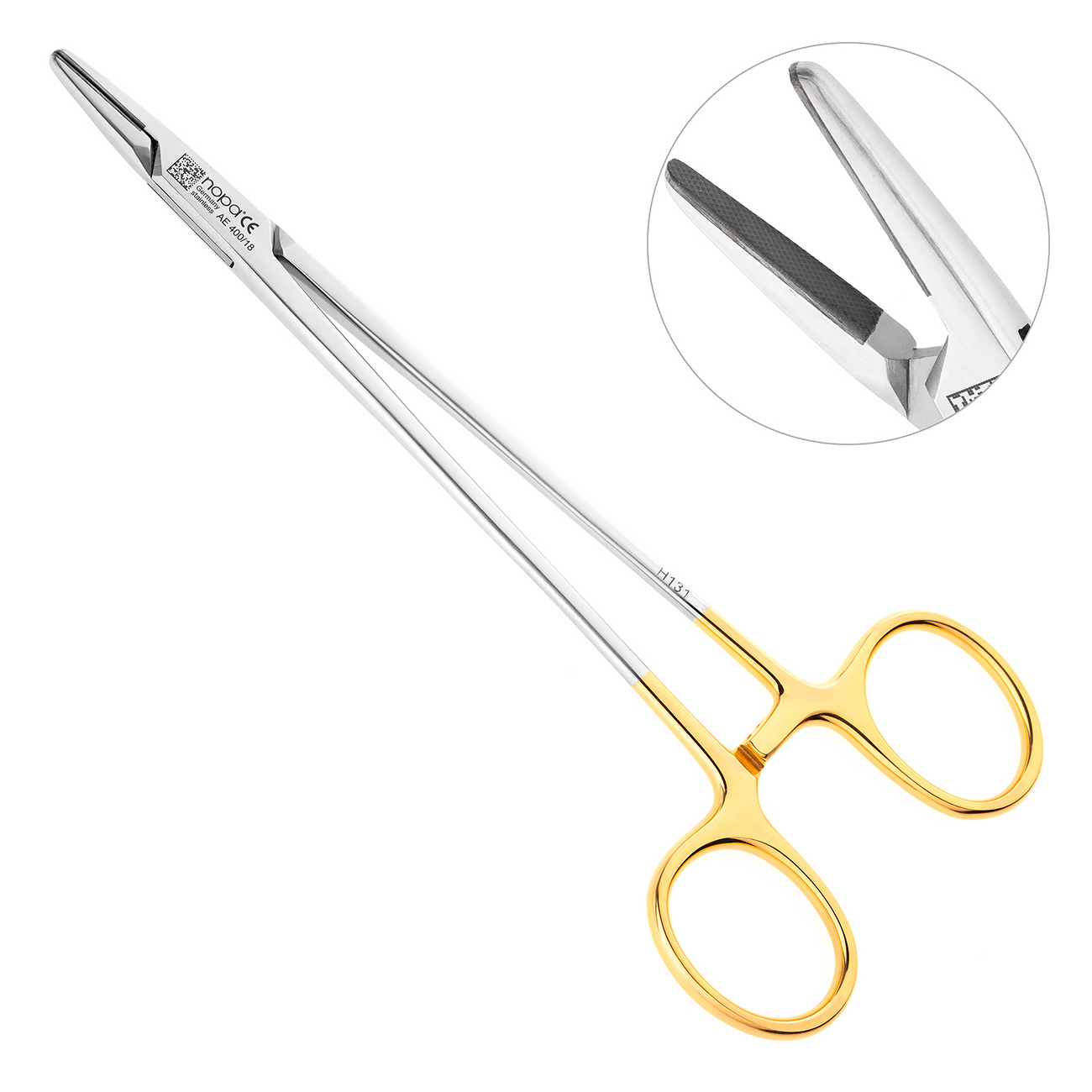 Прямые рабочие части на внутренних поверхностях инструмента покрыты мелкозернистым ретенционным узором, предупреждающим скольжение иглодержателя по плоскости хирургической иглы при наложении шва. Изнутри рабочие поверхности инструмента имеют вставки из твердого сплава карбид-вольфрама, которые обеспечивают повышенную устойчивость к истиранию. Такая конструкция щечек иглодержателя упрощает захват и освобождение иглы, а также способствует точному проведению иглы на всех стадиях наложения швов.