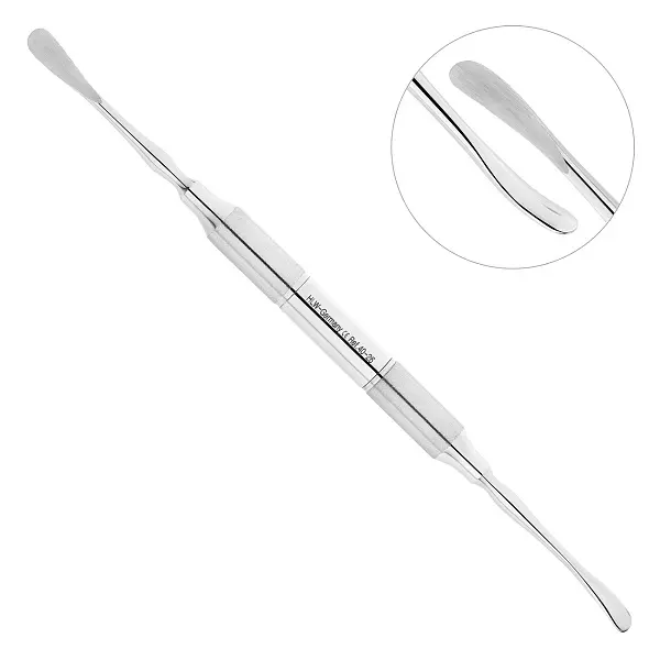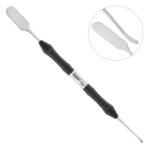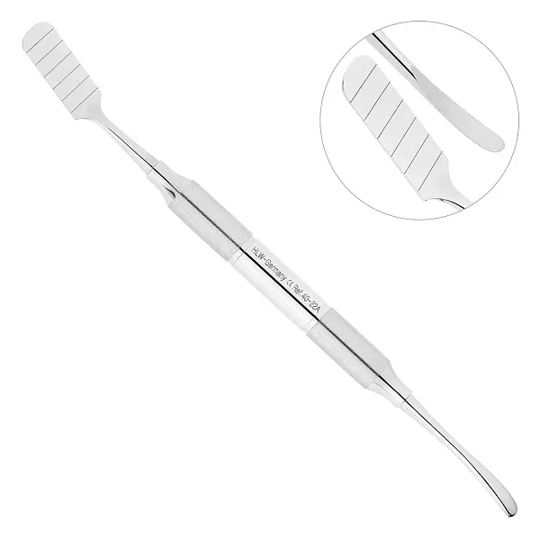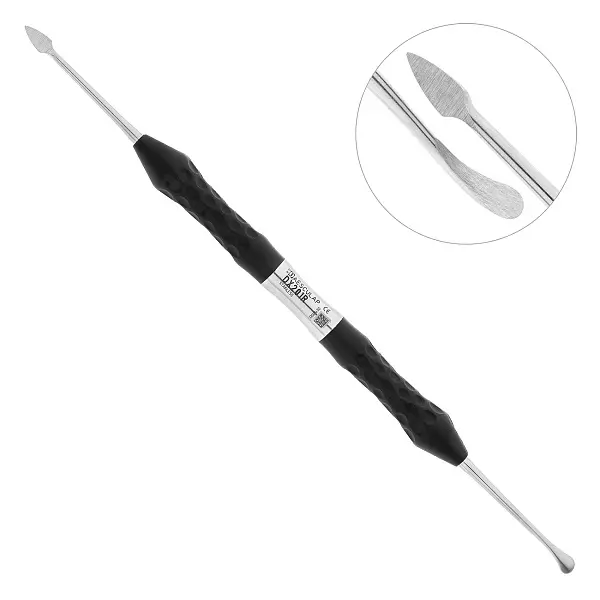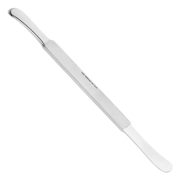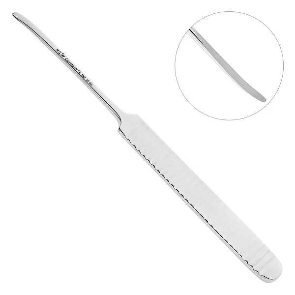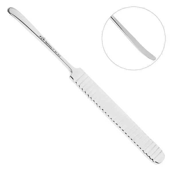Наружная поверхность ручек хирургического инструмента покрыта поперечными бороздками, предотвращающими скольжение фаланг пальцев в перчатке. С внутренней стороны к каждой ручке прикреплена пластиночная разводная пружина, обеспечивающая плавный ход инструмента.