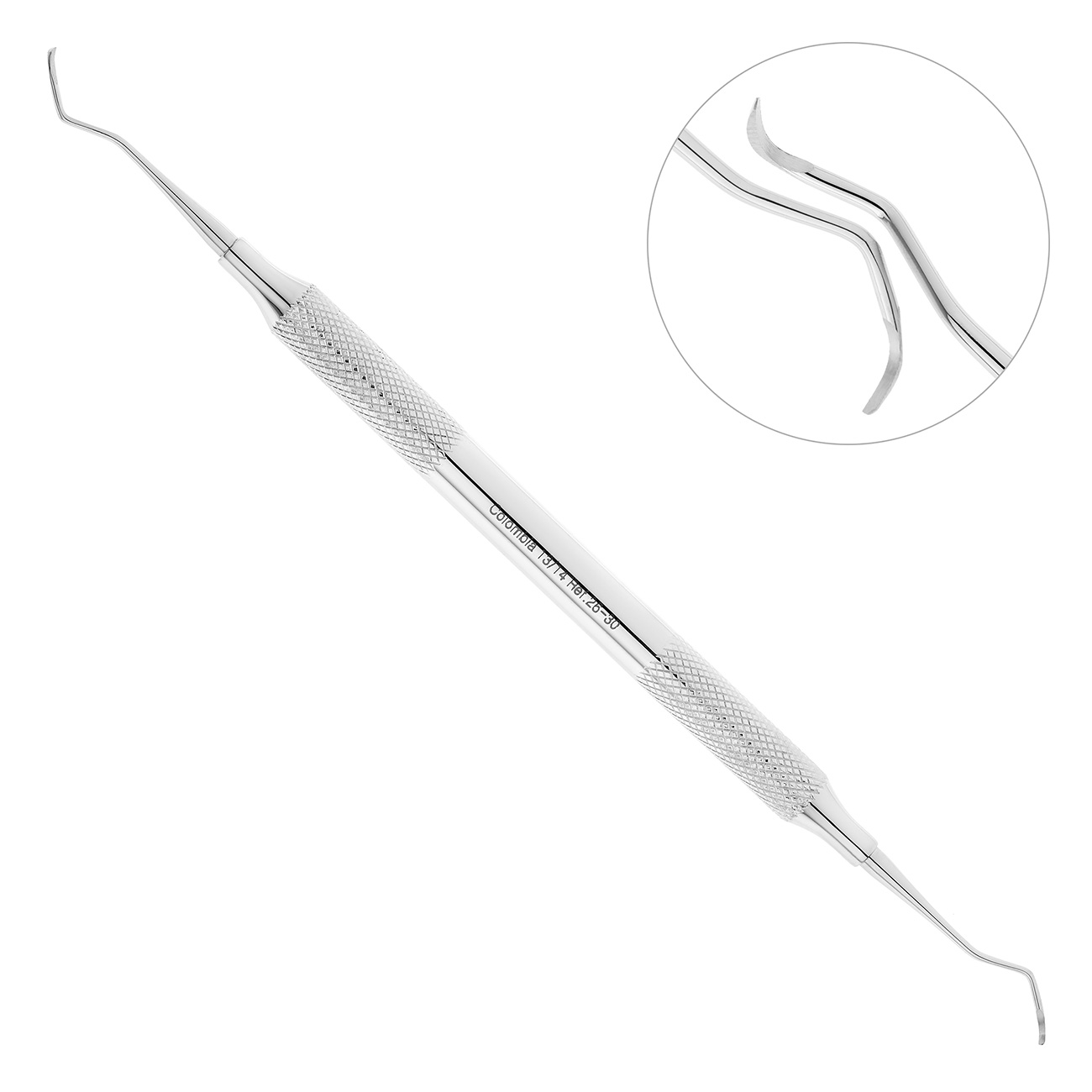 Ручка инструмента двусторонняя. С обоих концов рукоятки расположены зеркально отраженные рабочие части, каждая из которых имеет форму полукруга с острыми режущими краями. Лицевая поверхность кюреты расположена под прямым углом относительно терминального стержня, благодаря чему лезвие инструмента наилучшим образом адаптируется к поверхностям корней.