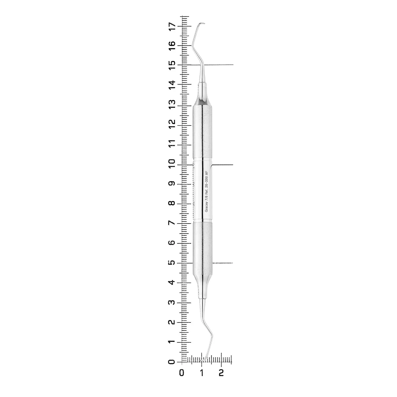 С обоих концов двусторонней ручки кюреты расположены зеркально отраженные рабочие части, каждая из которых имеет форму полукруга с острыми режущими краями. Рабочая часть инструмента имеет укороченный рабочий кончик, только один режущий край, расположенный под углом 60-70° по отношению к терминальному стержню. Такая конструкция кюреты идеально подходит для работы в глубоких пародонтальных карманах.