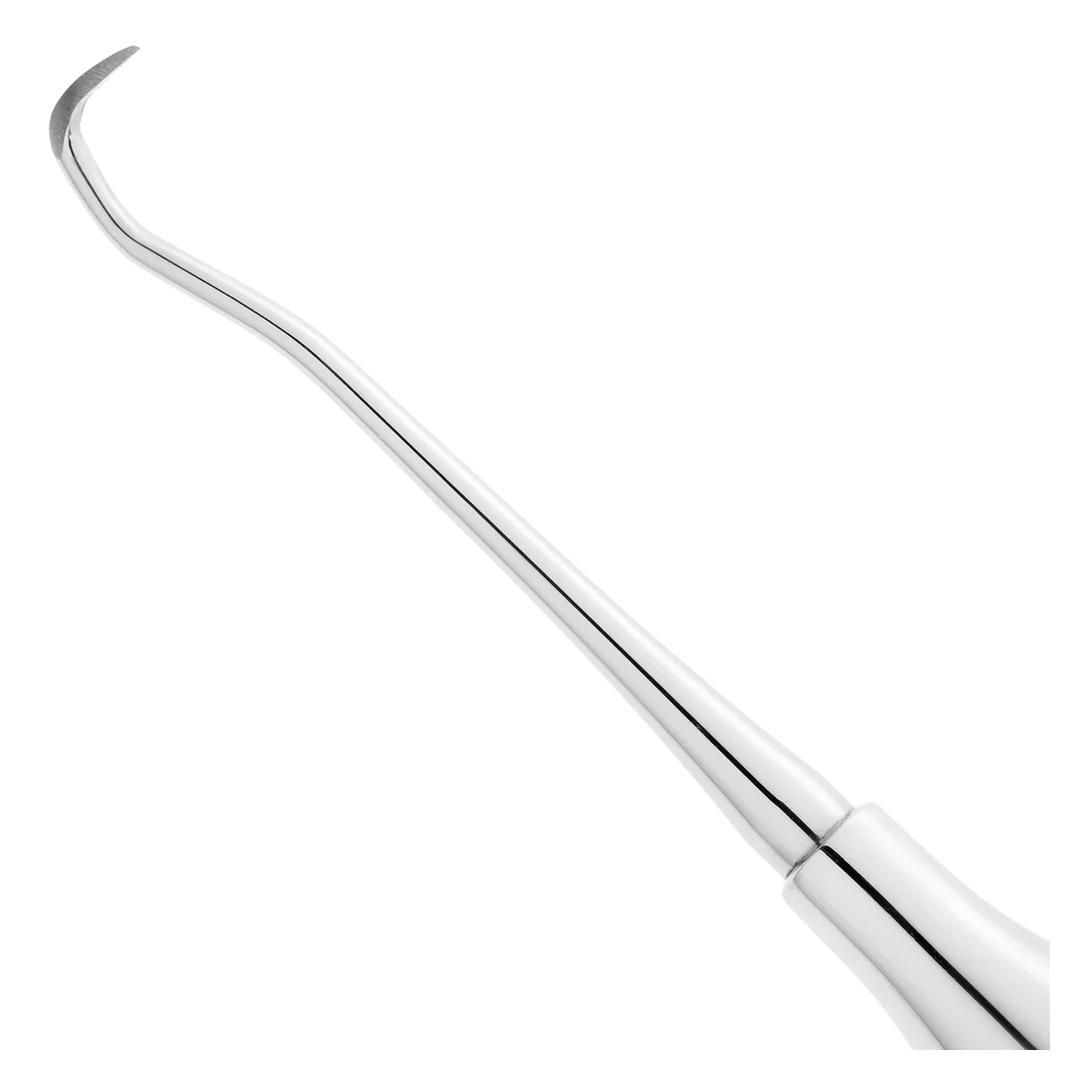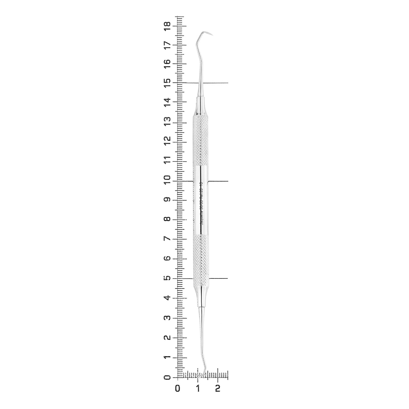 С обоих концов двусторонней рукоятки инструмента расположены зеркально отраженные рабочие части, каждая из которых имеет копьевидную форму, два лезвия и острый рабочий кончик. Угол между лицевой поверхностью и терминальным стержнем составляет 90°. Конструкция скейлера идеально подходит для работы над десной или на уровне десны.