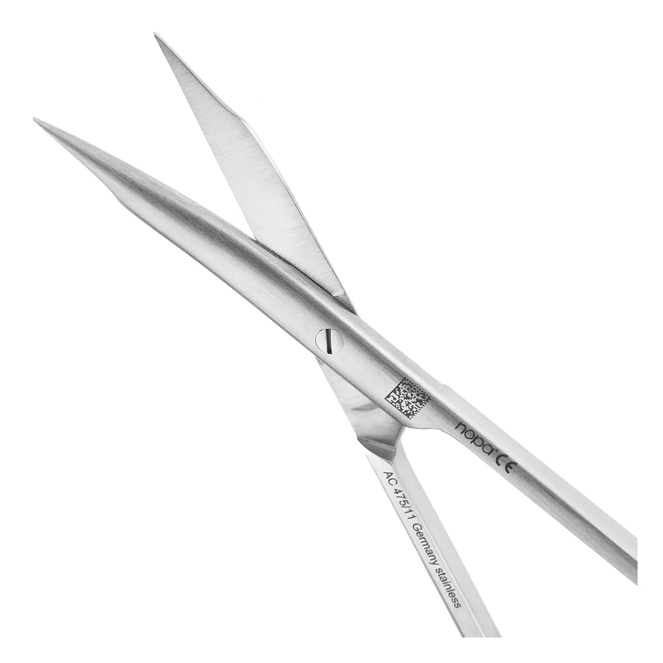 Рабочая часть ножниц изогнута по плоскости. Симметричные заостренные рабочие части ножниц истончаются к вершине. Такая конструкция лезвий облегчает проведение операции по коррекции мягких тканей.