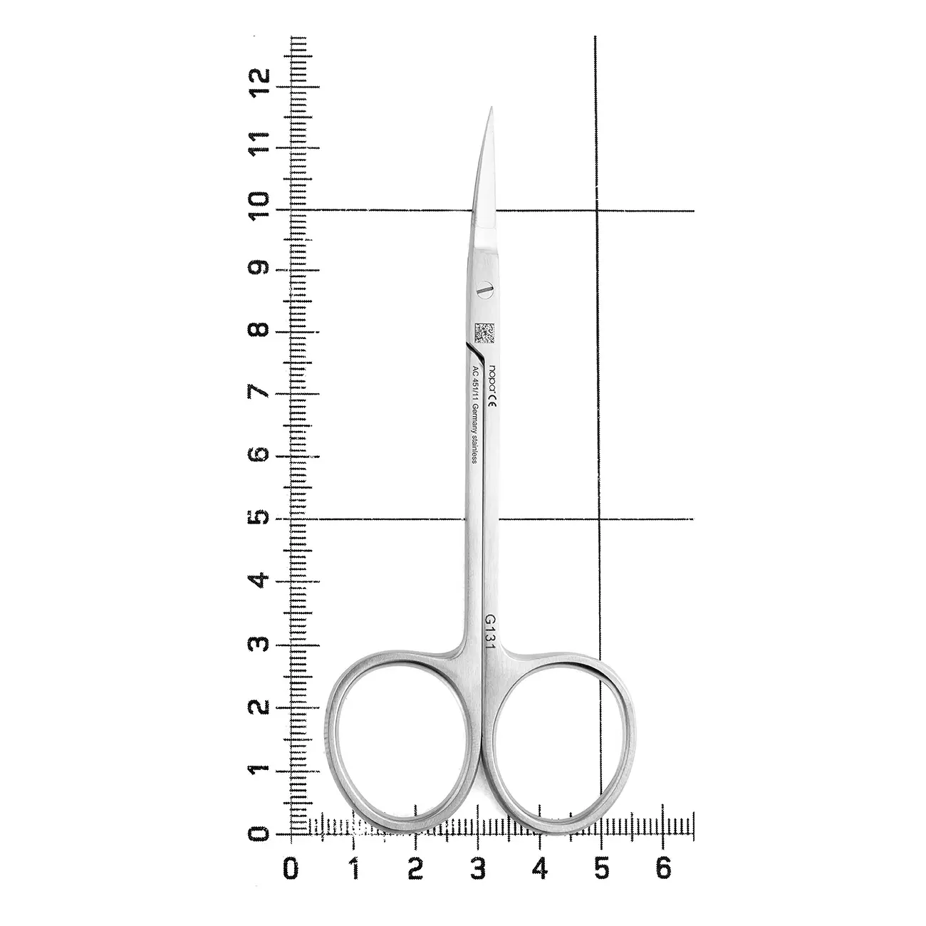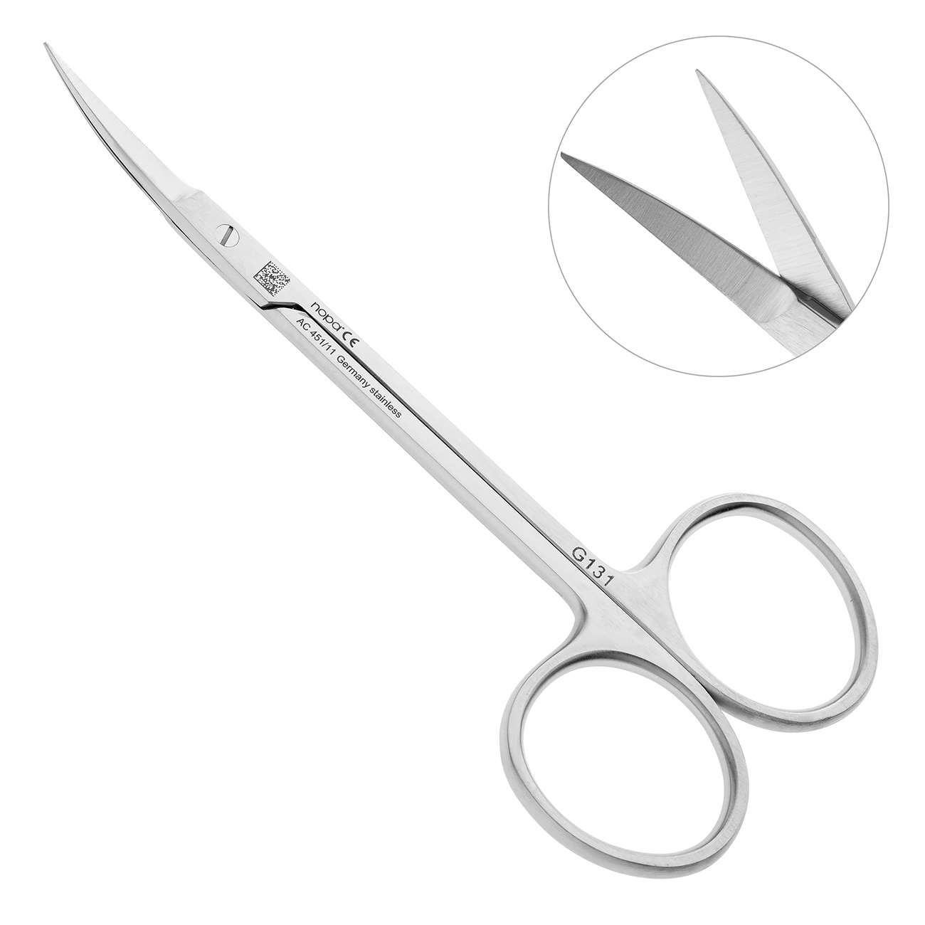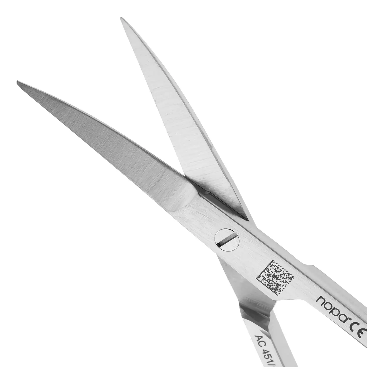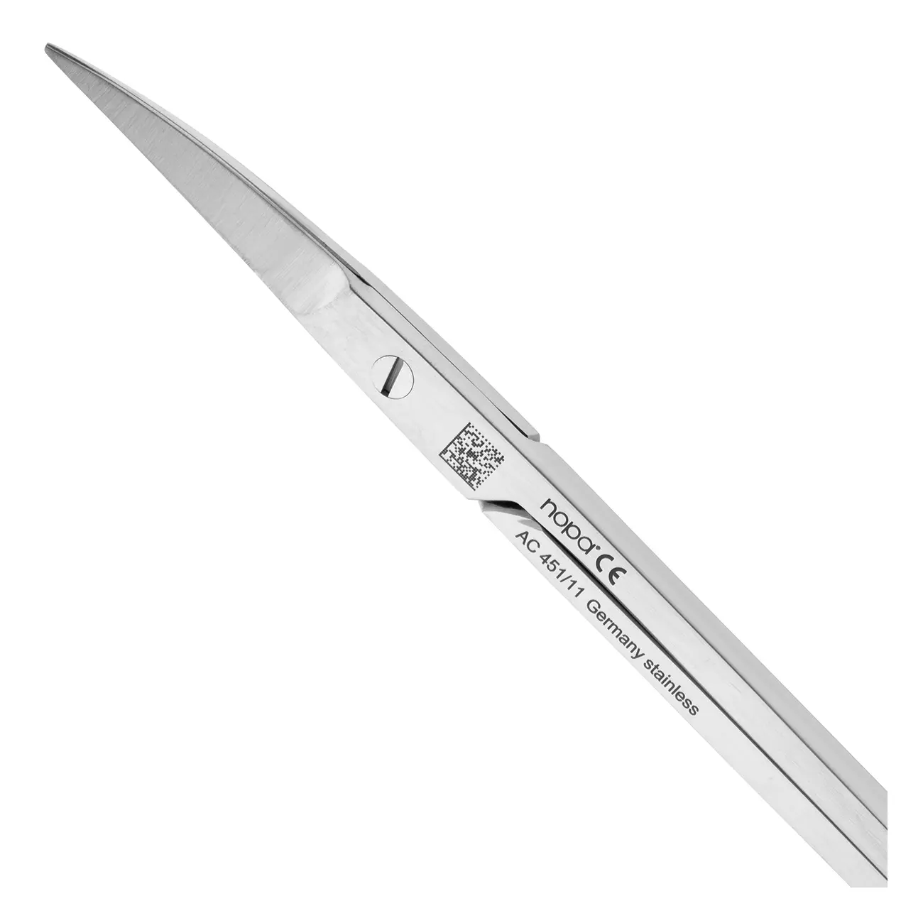 Рабочая часть ножниц изогнута по плоскости, стандартной треугольной формы с тонкими, острыми, режущими краями позволяет работать с мягкими тканями и шовным материалом.