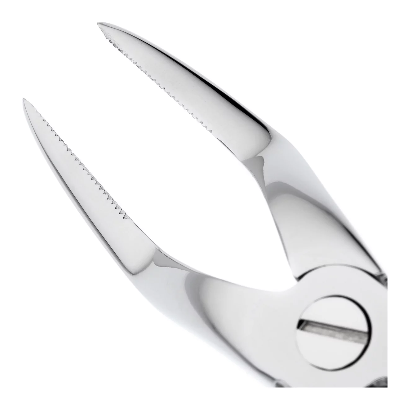 Рабочая часть инструмента имеет штыковидный (байонетный) изгиб. Щечки щипцов удлиненные, сходящиеся и имеют продольно-поперечные насечки на внутренних поверхностях рабочих частей, что обеспечивает плотный захват корня и облегчает его удаление.