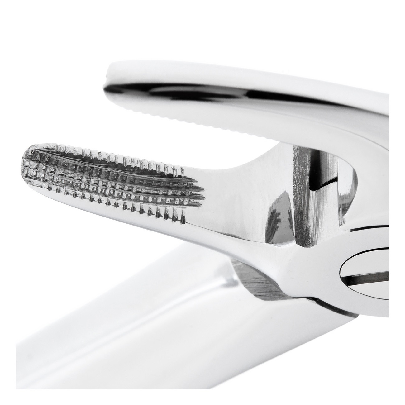 Клювовидный инструмент изогнут по ребру. Ручки щипцов имеют стандартные формы, наружная поверхность ручек покрыта ретенционным узором, предотвращающим скольжение фаланг пальцев в перчатке.