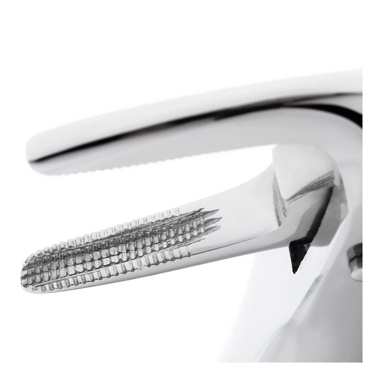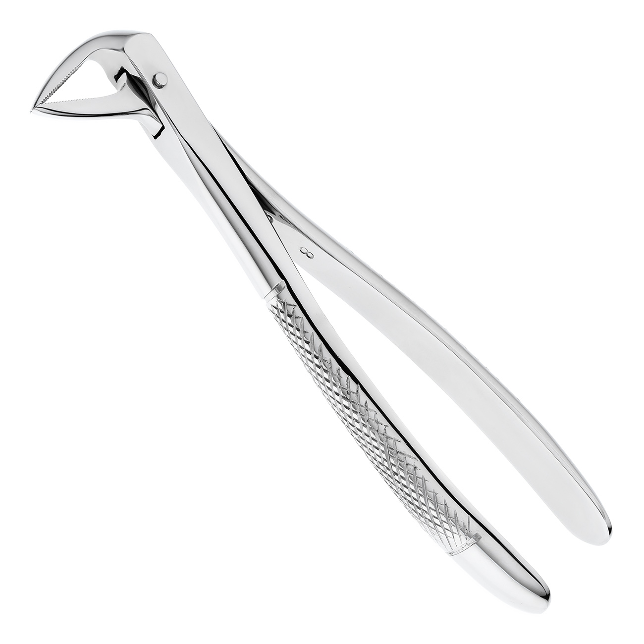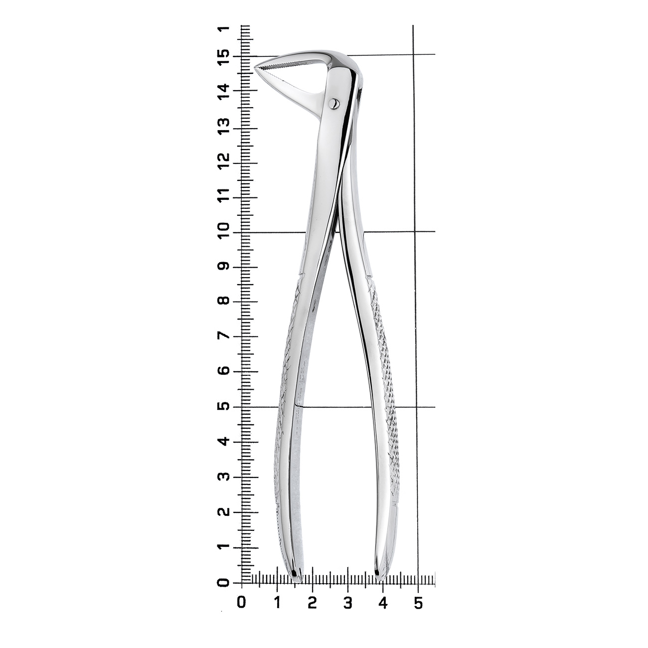 Рабочие части щипцов сходящиеся, узкие, удлиненные и имеют продольно-поперечные насечки на внутренних поверхностях щечек инструмента, за счет которых осуществляется надежный захват и фиксация щипцов на корне зуба.