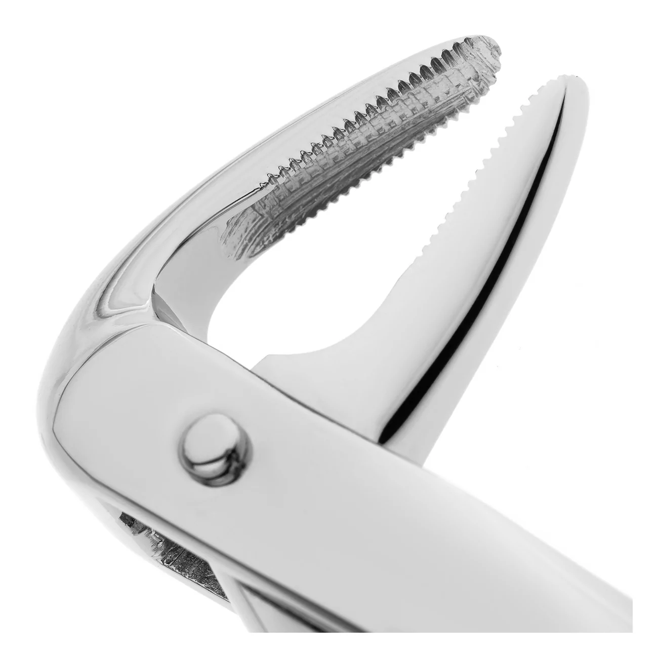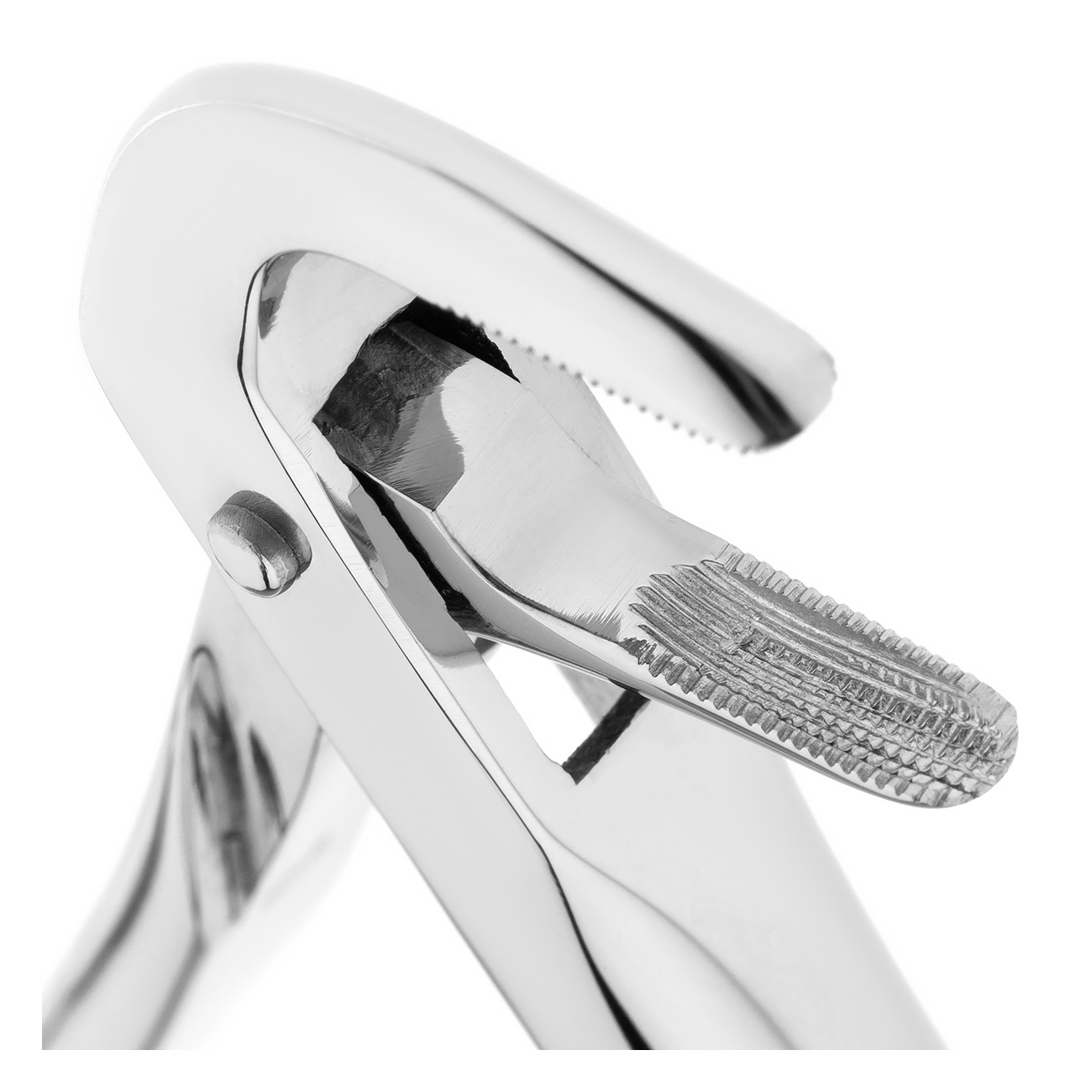 Рабочие части клювовидного инструмента сходящиеся. За счет продольно-поперечных насечек на внутренних поверхностях щечек щипцов происходит надежный захват и фиксация инструмента на корне.