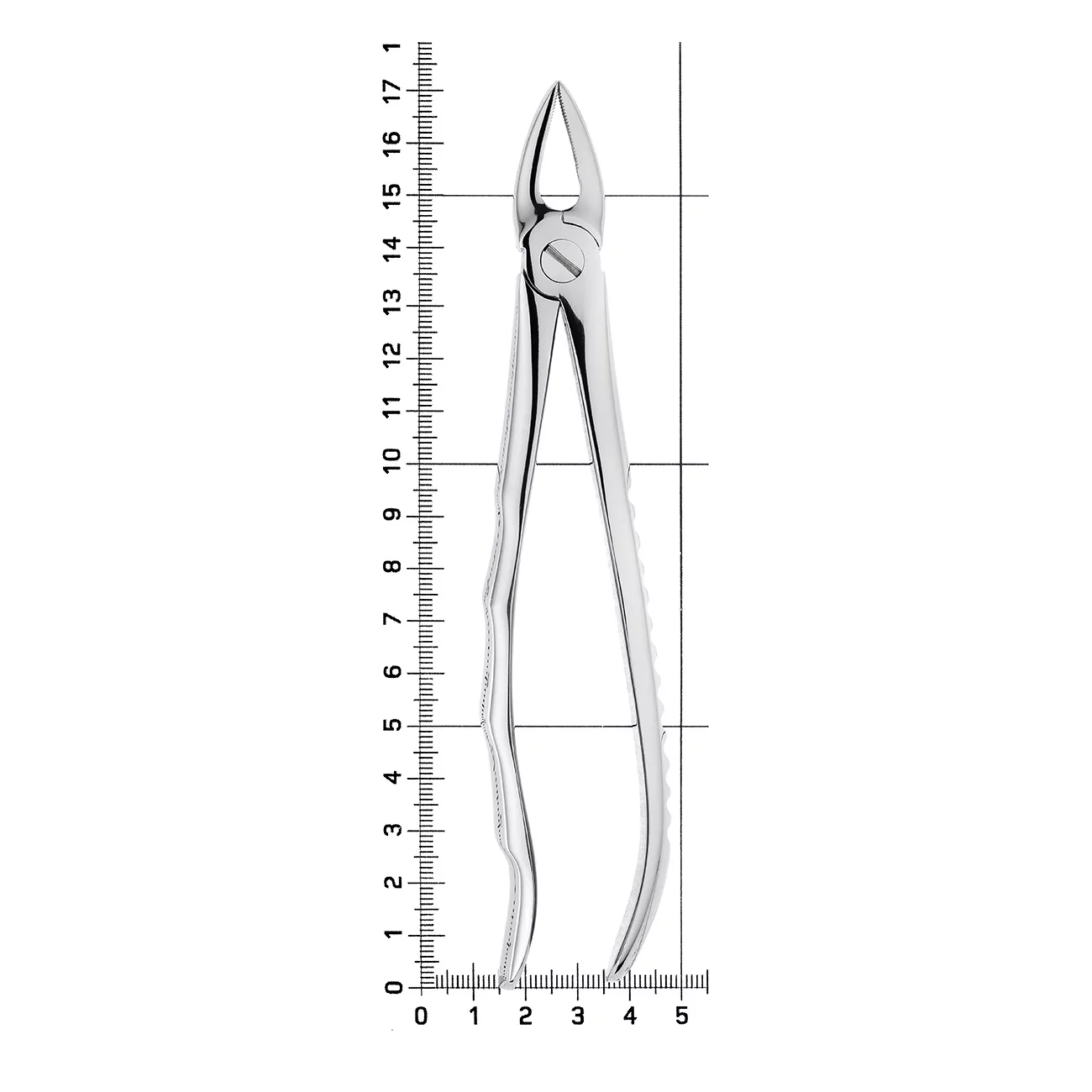 Рабочие части щипцов прямые, сходящиеся, расположены в одной плоскости с продольной осью инструмента. На внутренней поверхности щечек имеются продольно-поперечные насечки. В основании шарнирного соединения стоматологического инструмента имеется тефлоновая вставка, обеспечивающая плавный ход щипцов.