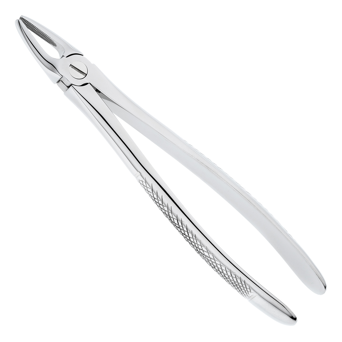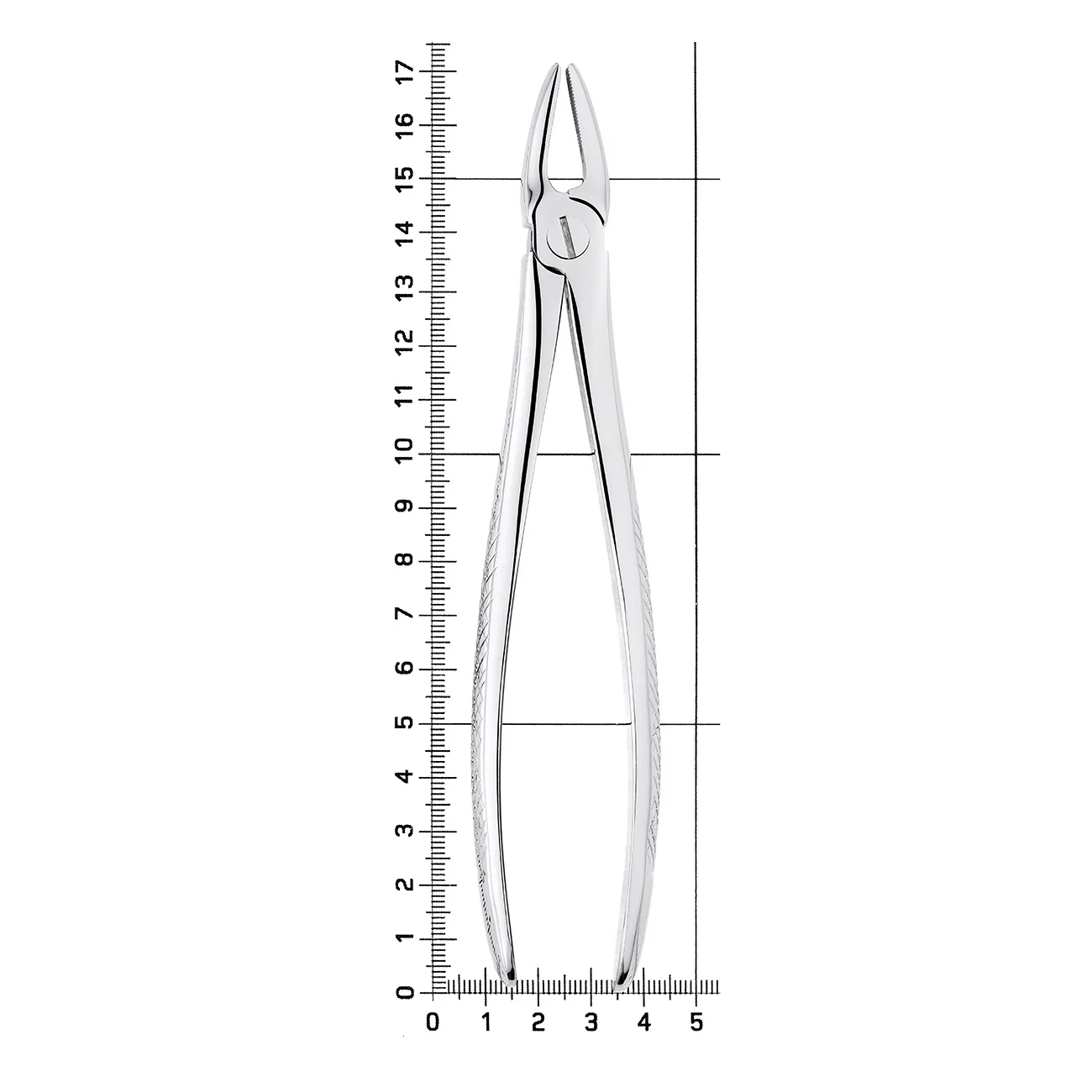 Рабочие части инструмента имеют прямую форму. Продольные оси щечек и ручек находятся в одной плоскости. Щечки узкие, не сходящиеся, с внутренней поверхности рабочей части имеют продольно-поперечные насечки. Такая конструкция щипцов позволяет правильно наложить и зафиксировать их на зубе, и при его удалении.