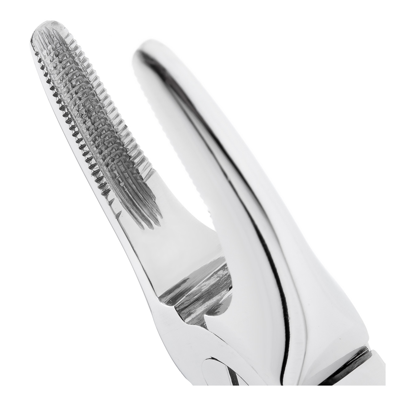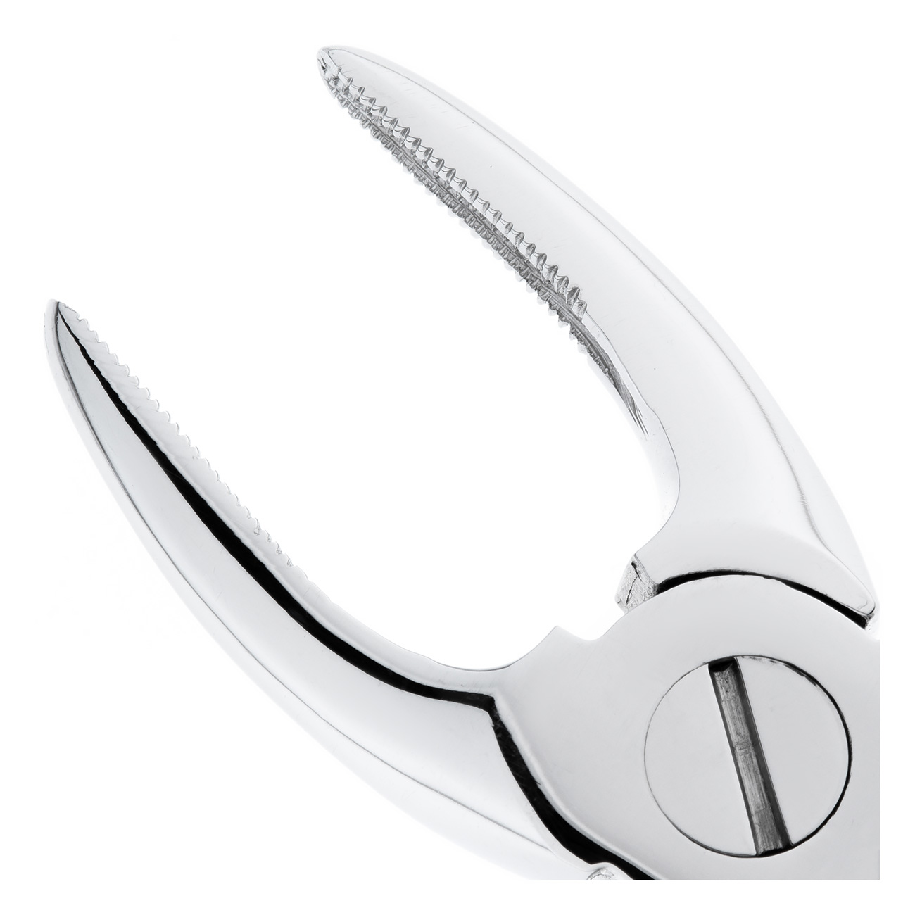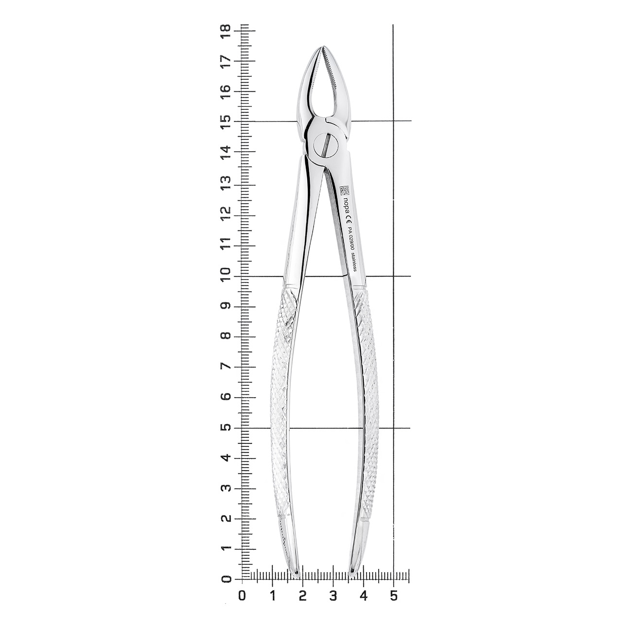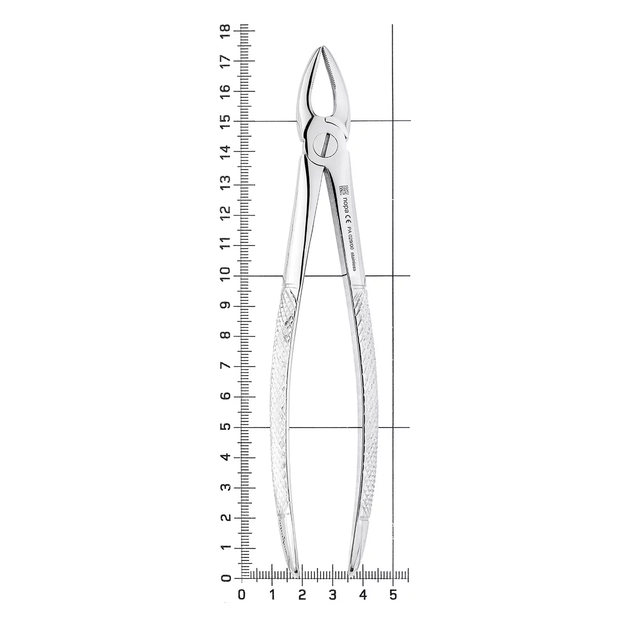 Прямые рабочие части щипцов, сходящиеся на конце, расположены в одной плоскости с продольной осью инструмента. На внутренней поверхности щечек имеются продольно-поперечные насечки, надежно фиксирующие корни при удалении.