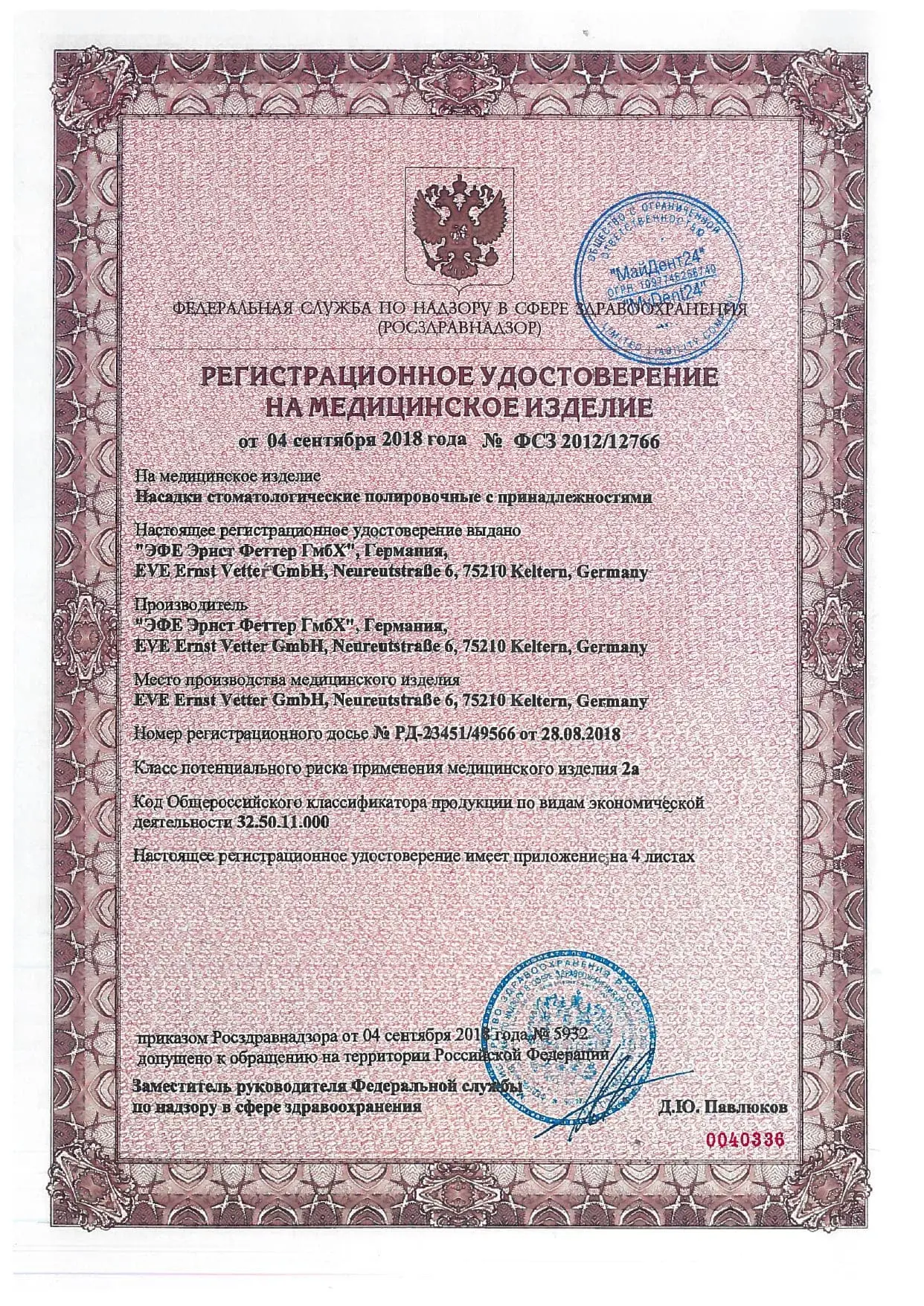 № ФСЗ 2012/12766 от 04.09.2018