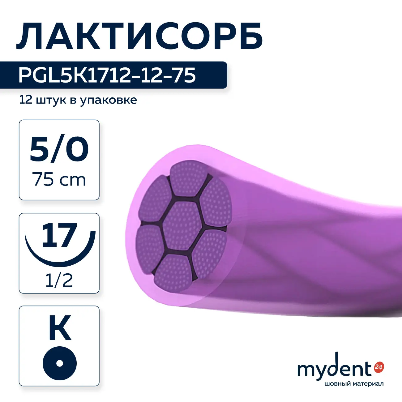 Шовный материал Лактисорб A 5/0 braided K 17 mm 1/2 75 cm (12 шт) фиолетовая нить