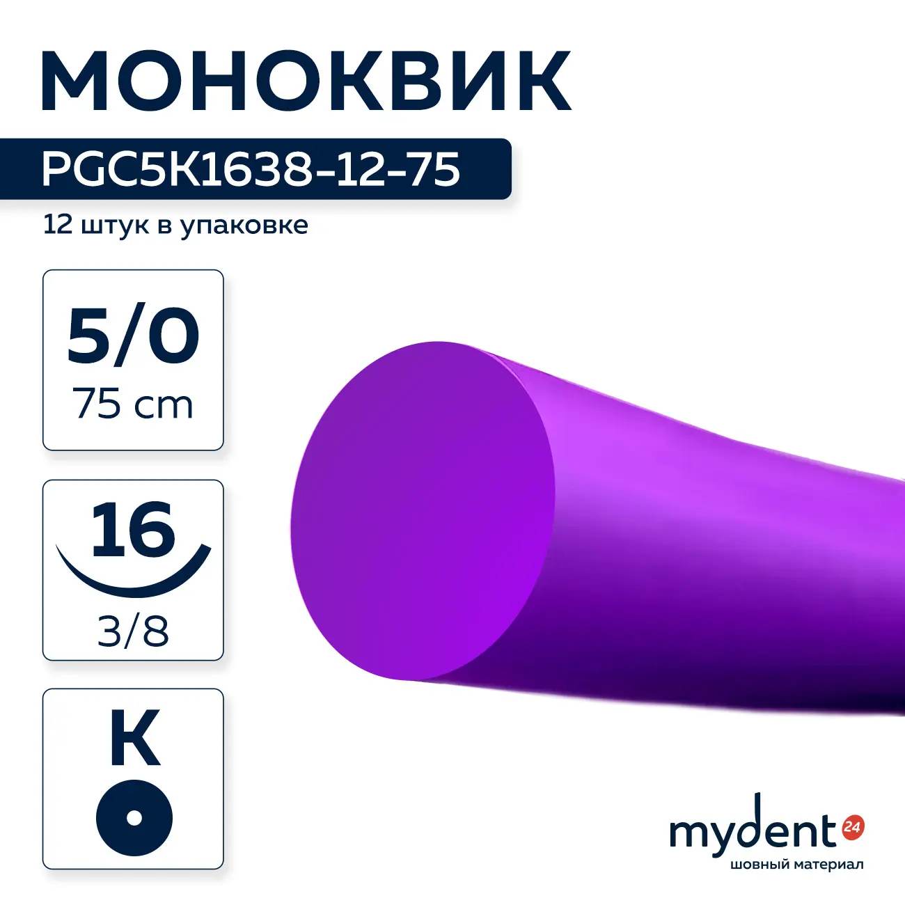 Шовный материал Моноквик A 5/0 mono K 16 mm 1/2 75 cm (12 шт) фиолетовая нить