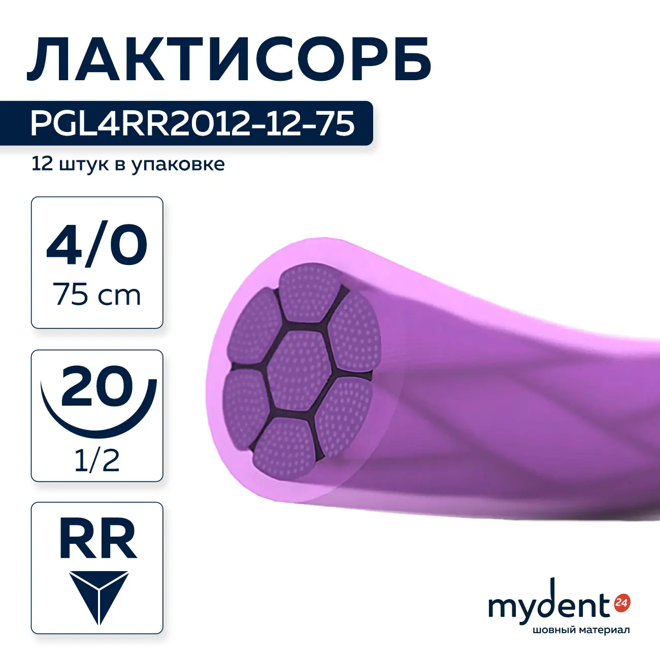 Шовный материал Лактисорб A 4/0 braided RR 20 mm 1/2 75 cm (12 шт) фиолетовая нить