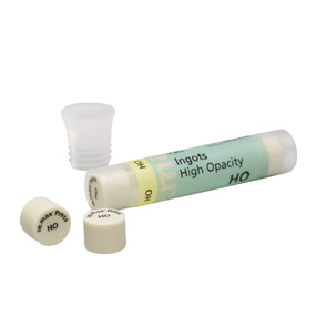 IPS e.max Press HO (High Opacity – высокая опаковость) для сильно измененных в цвете зубов или при фиксации на титановые абатменты. Выпускаются в 3 группах цветов (HO 0, HO 1, HO 2).